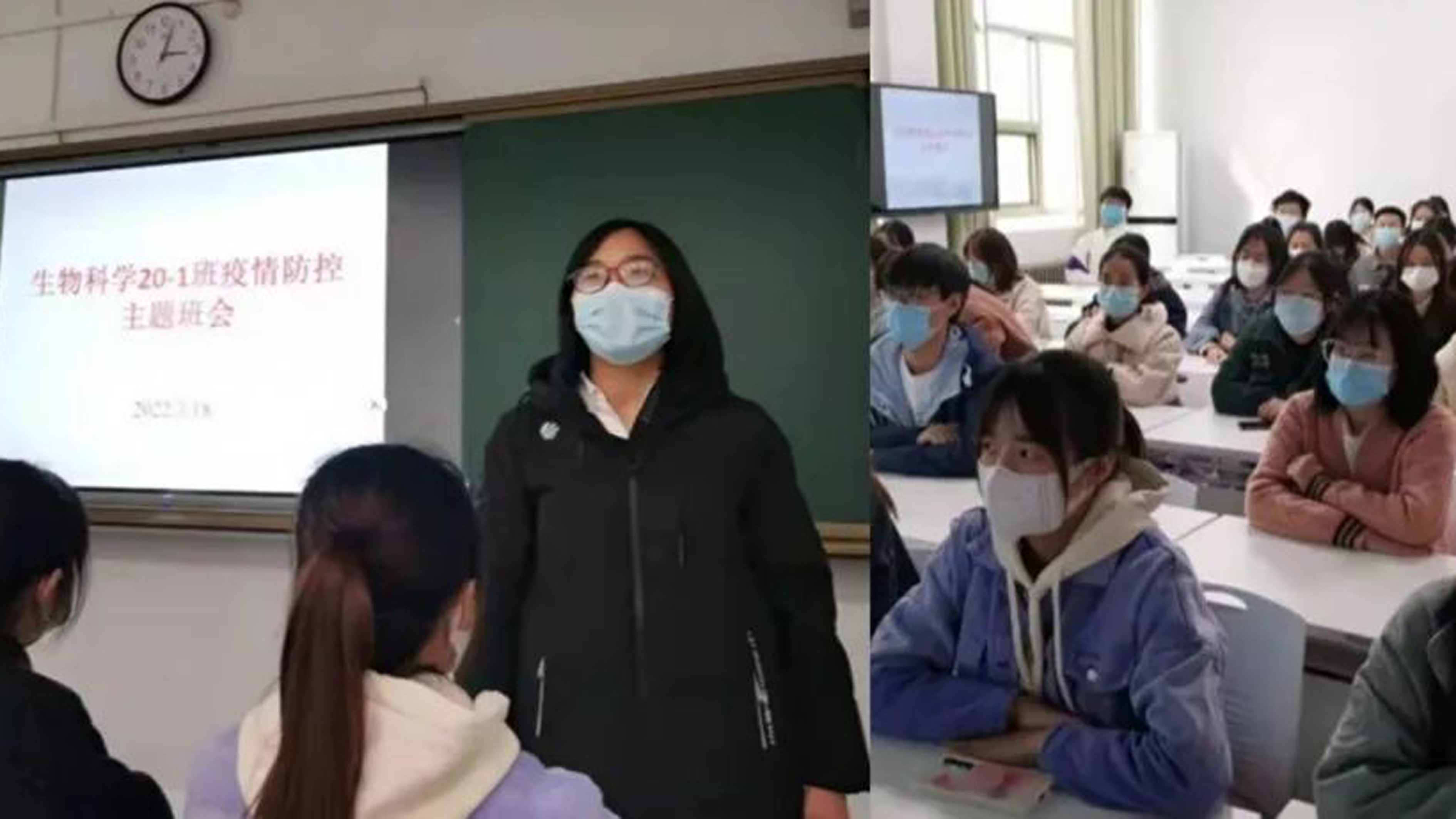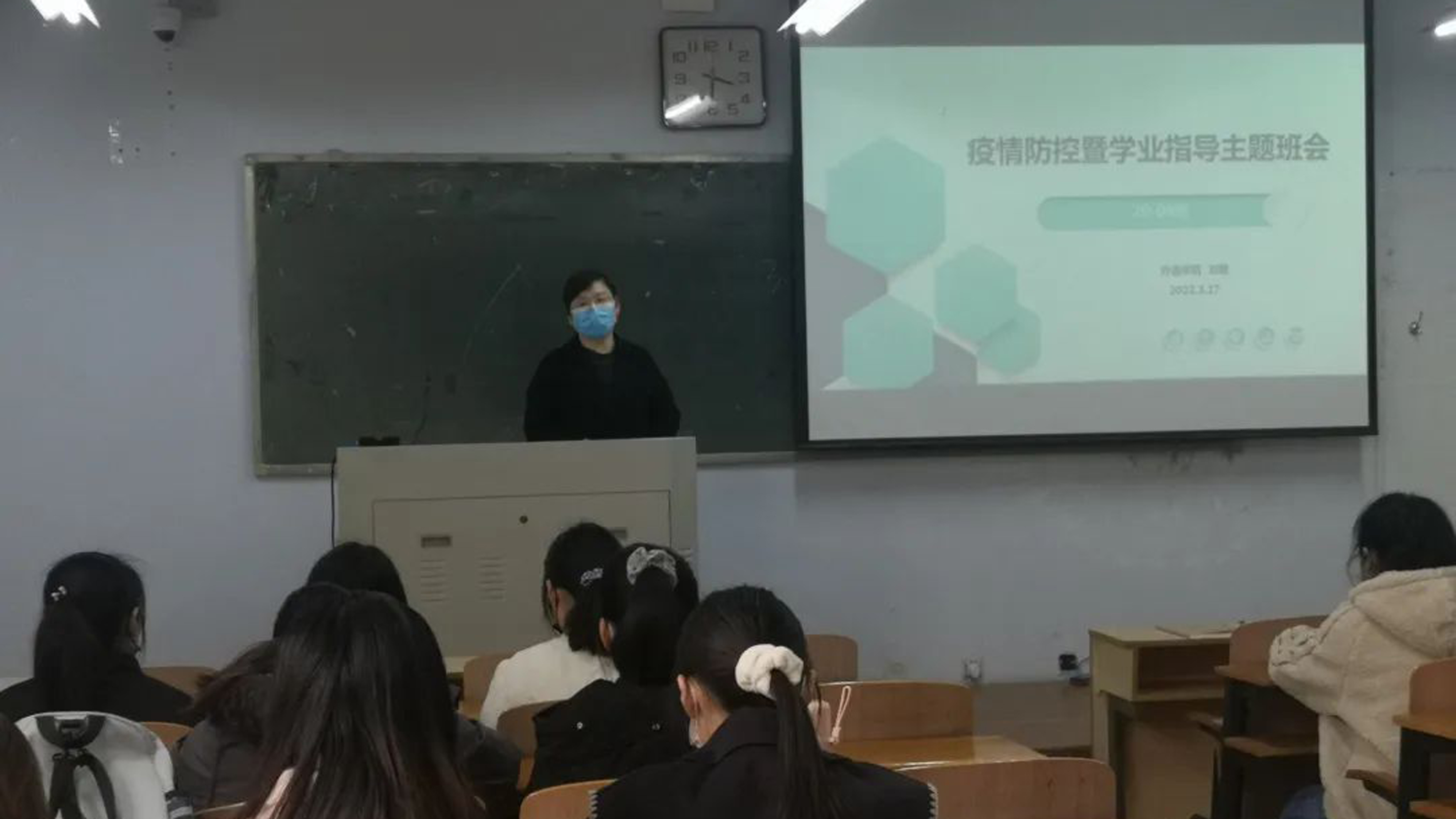各班班主任老师根据当前疫情防控的严峻形势,从我国疫情现状、校园防疫要求、个人防护措施等方面向学生详加讲述。反复告知学生要严格按照学校疫情防控要求,坚持钉钉打卡、查阅当天的健康码与行程码、体温监测等,如有不适症状要第一时间上报辅导员老师。提醒学生要遵守学校封闭管理相关规定,勤洗手、常通风、戴口罩、保持社交距离,非必要不网购,疫情常态化下的科学防疫等。积极引导学生正确认识疫情,科学合理地安排好学习和生活,鼓励学生增强抗击疫情的信心。