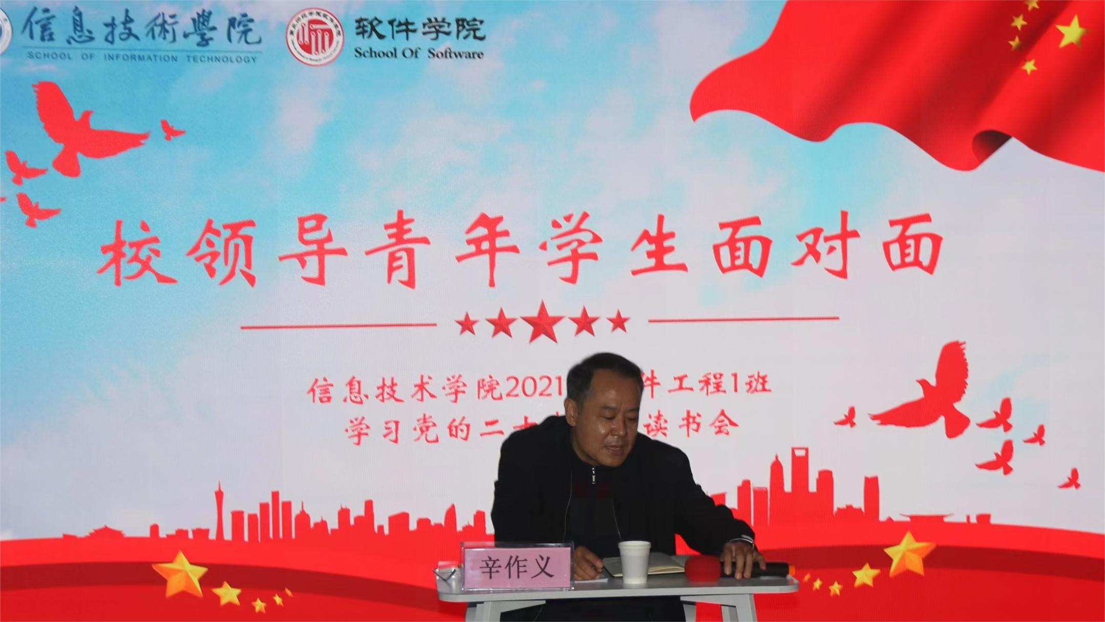 11月10日,信息技术学院2021级软件工程1班在梁园校区三商楼322室举行学习党的二十大精神读书会,副校长辛作义参加了读书会并作了专题辅导报告。读书会由信息技术学院党委书记王国华主持。