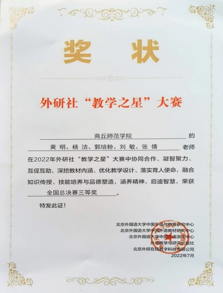 2022年7月外研社“教学之星”大赛在云端落下帷幕,外语学院黄明教师团队经过层层选拔,最终取得了全国半决赛二等奖、全国总决赛三等奖的好成绩,该成绩为本项国家级教学竞赛自437ccm·必赢国际外语学院参赛以来的最好成绩。
