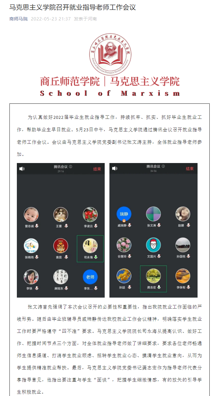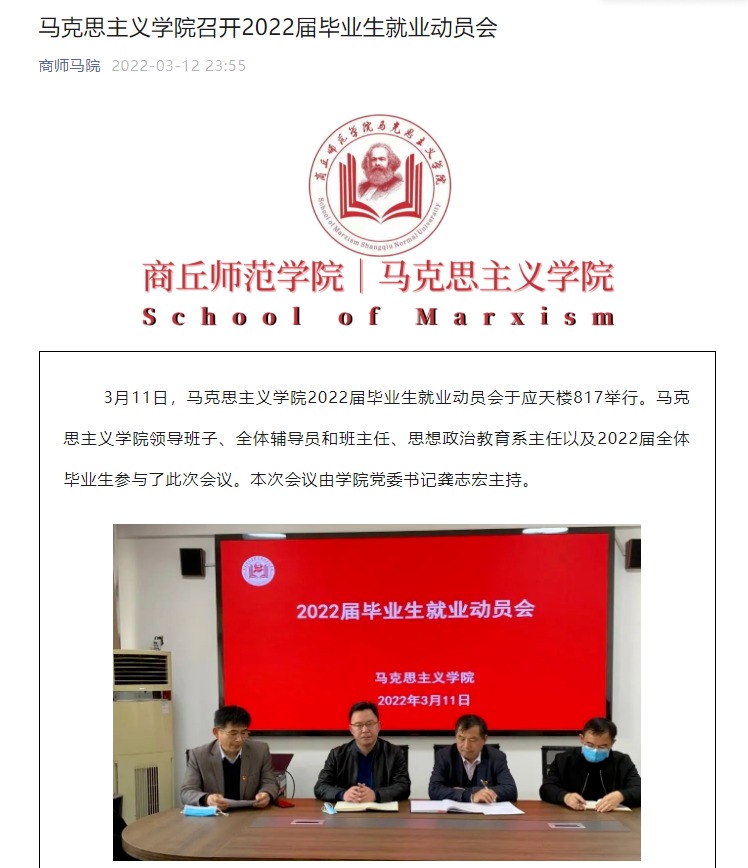 2022届毕业生就业工作启动后,学院立即成立2022届毕业生就业工作领导组,把毕业生就业工作作为一项紧迫的政治任务来抓,主动作为、研判形势、破解难题,先后召开2次专题会议,2次毕业生就业座谈会,走访周边中小学校了解思政课教师岗位缺编情况4次,精准推荐毕业生就业。组建领导带头、全员参与的就业工作队,构建完善纵向到底、横向到边、精准到人的就业服务工作网络,形成了全员抓就业、促就业的工作格局。健全就业工作推进与反馈机制,压实工作责任,院领导班子每2周召开一次就业工作例会,听取推进情况和加强工作交流,确保就业大局稳定、工作推进有序有力。加强就业辅导员、班主任团队建设,强化线上就业指导业务培训,先后2次学习研讨河南省大学生就业创业服务指南,组织就业指导教师积极申报全省大中专院校就业创业课题研究2项,不断提升就业工作队伍工作水平。构建以毕业生就业率和就业质量为重点考核指标,分解细化就业工作目标责任,建立完善就业导师制、毕业班辅导员联络机制,制订就业工作台账,实行就业销号管理等,强化目标考核和过程管理,增强就业工作主动性。