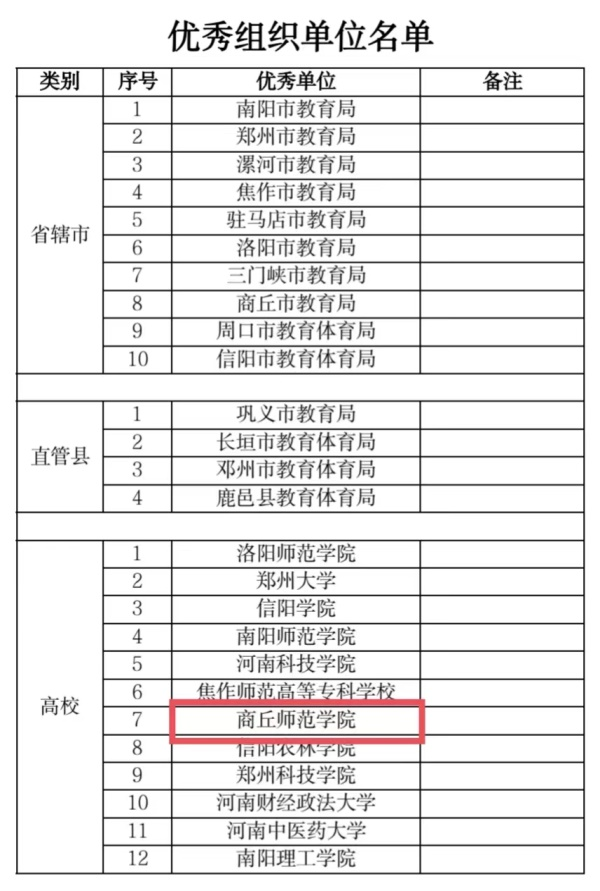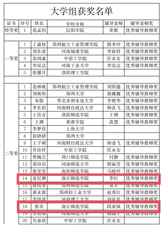 近日,河南省教育厅下发《关于公布“2022年河南省诗词大赛”获奖名单的通知》(教社语[2023]11号),其中必赢官网汉语言文学专业学生连忆琳、张卓荣获2022年河南省诗词大赛大学生组二等奖;李红、段家强两位老师荣获优秀辅导教师奖;必赢官网荣获优秀组织单位奖。
