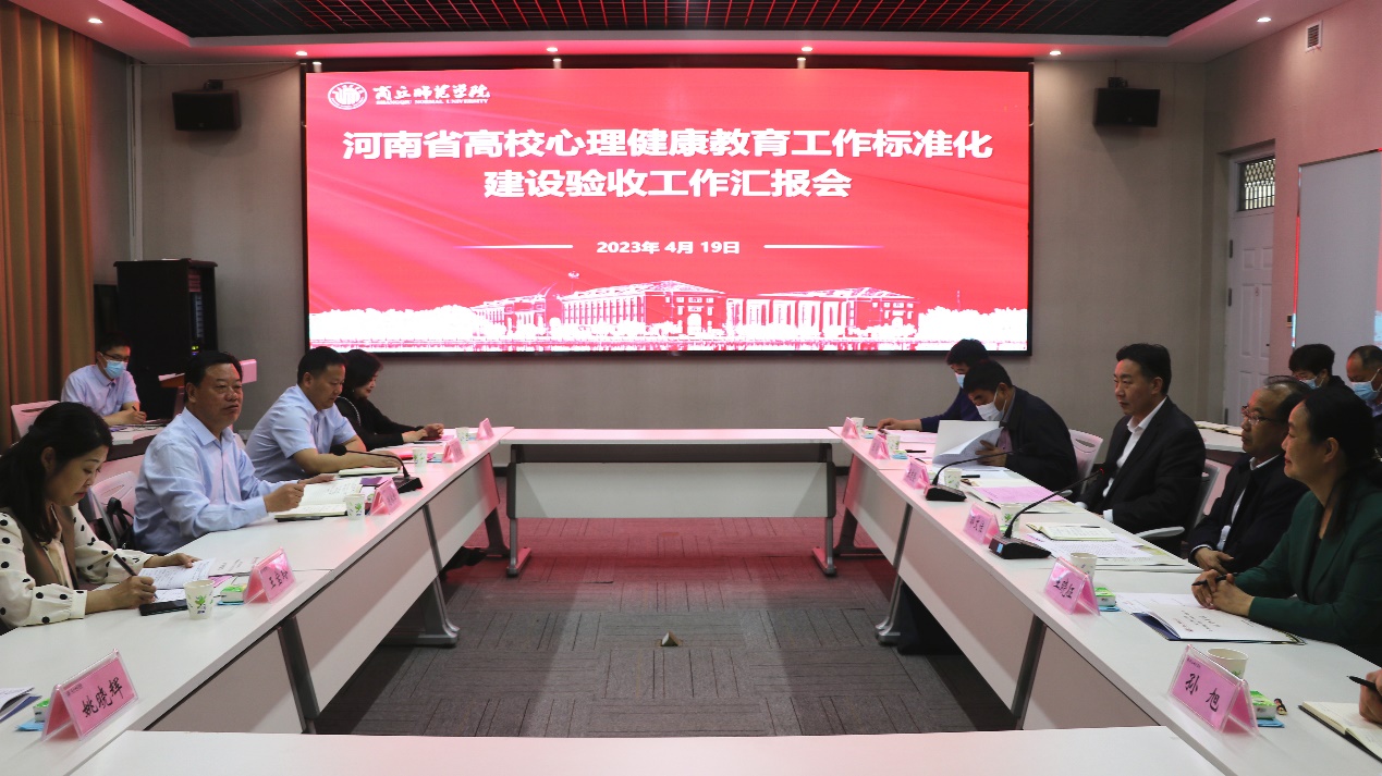 4月19日,以南阳师范学院党委副书记谢冰松为组长的河南省普通高等学校心理健康教育工作标准化建设第二验收专家组一行五人到必赢官网开展验收工作。专家组通过听取汇报、访谈交流、查阅资料、实地考察等环节,对必赢官网心理健康教育工作标准化建设实施情况进行了深入考察。校党委书记张志坚、副校长郭文佳,以及大学生心理健康教育工作领导小组全体成员出席汇报会。汇报会由副校长郭文佳主持。