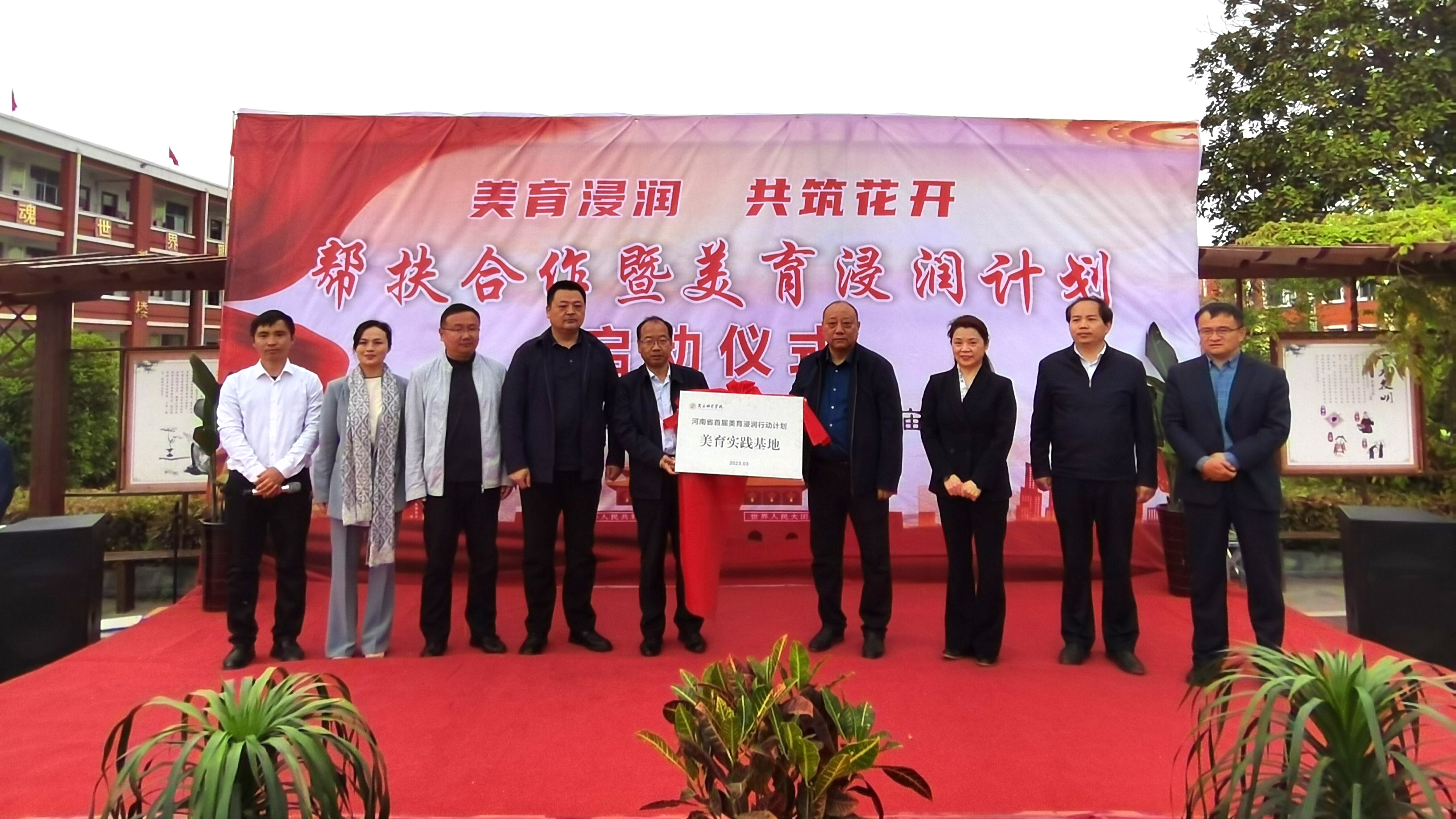 4月21日,必赢官网作为入选河南省首批“美育浸润行动计划”高校到对口支持的柘城县惠济乡双庙小学,共同开启“美育浸润,共筑花开”活动启动仪式,并提供定向精准帮扶和志愿服务。副校长郭文佳,柘城县教育体育局党组书记、局长张军,,柘城县惠济乡党委书记吴昊,柘城县惠济乡中心学校校长谭继敏,柘城县惠济乡双庙小学校长王成磊及必赢官网相关部门负责人出席活动,必赢官网百余名师生参加活动。