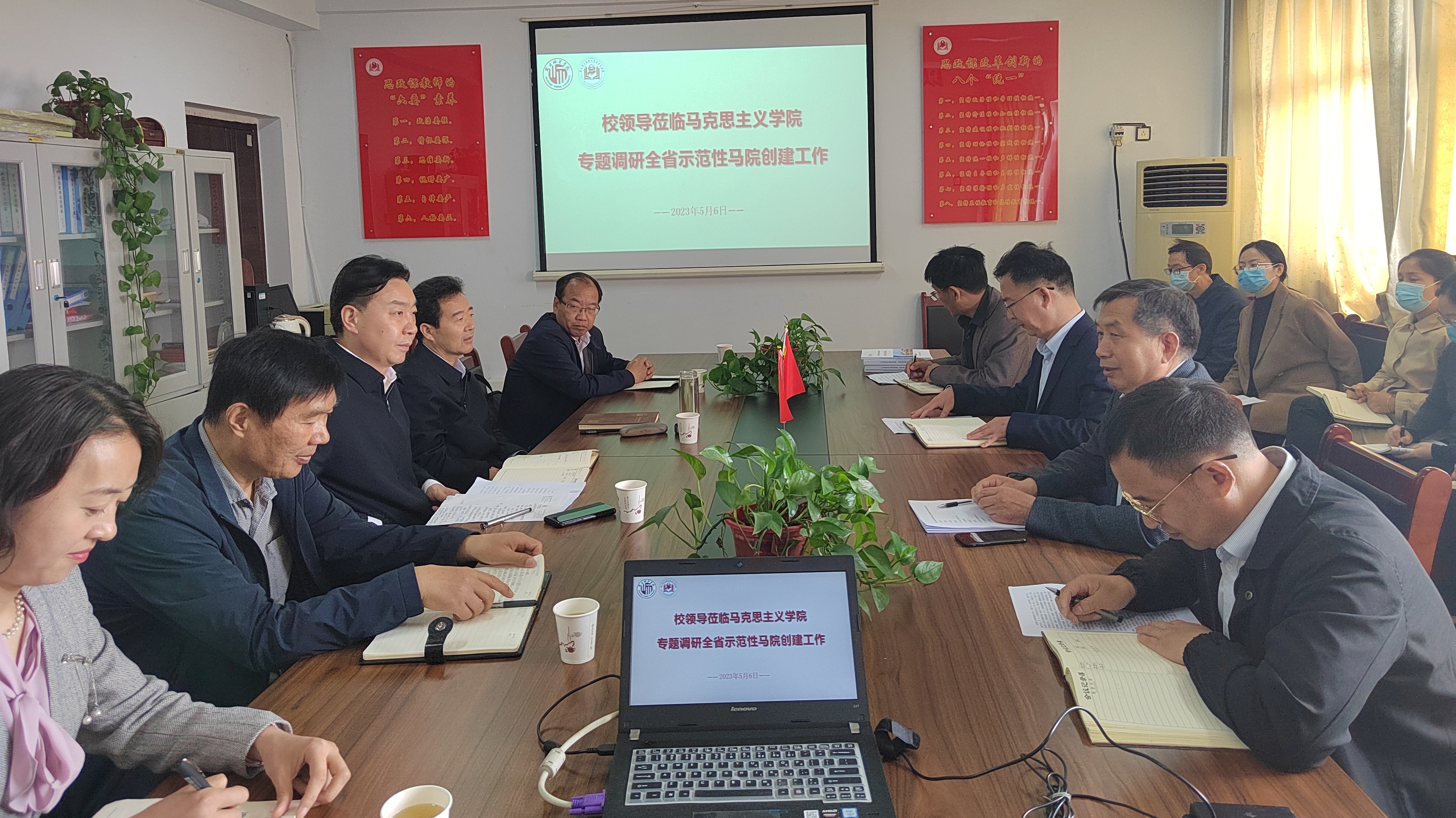 5月6日,校党委书记张志坚,校长陈向炜,校党委副书记、工会主席朱伟,副校长郭文佳在党政办主任陪同下到马克思主义学院,就全省示范性马克思主义学院创建工作进行专题调研。马克思主义学院班子成员、科级干部、基层教学组织负责人、教师代表参加了调研座谈会。