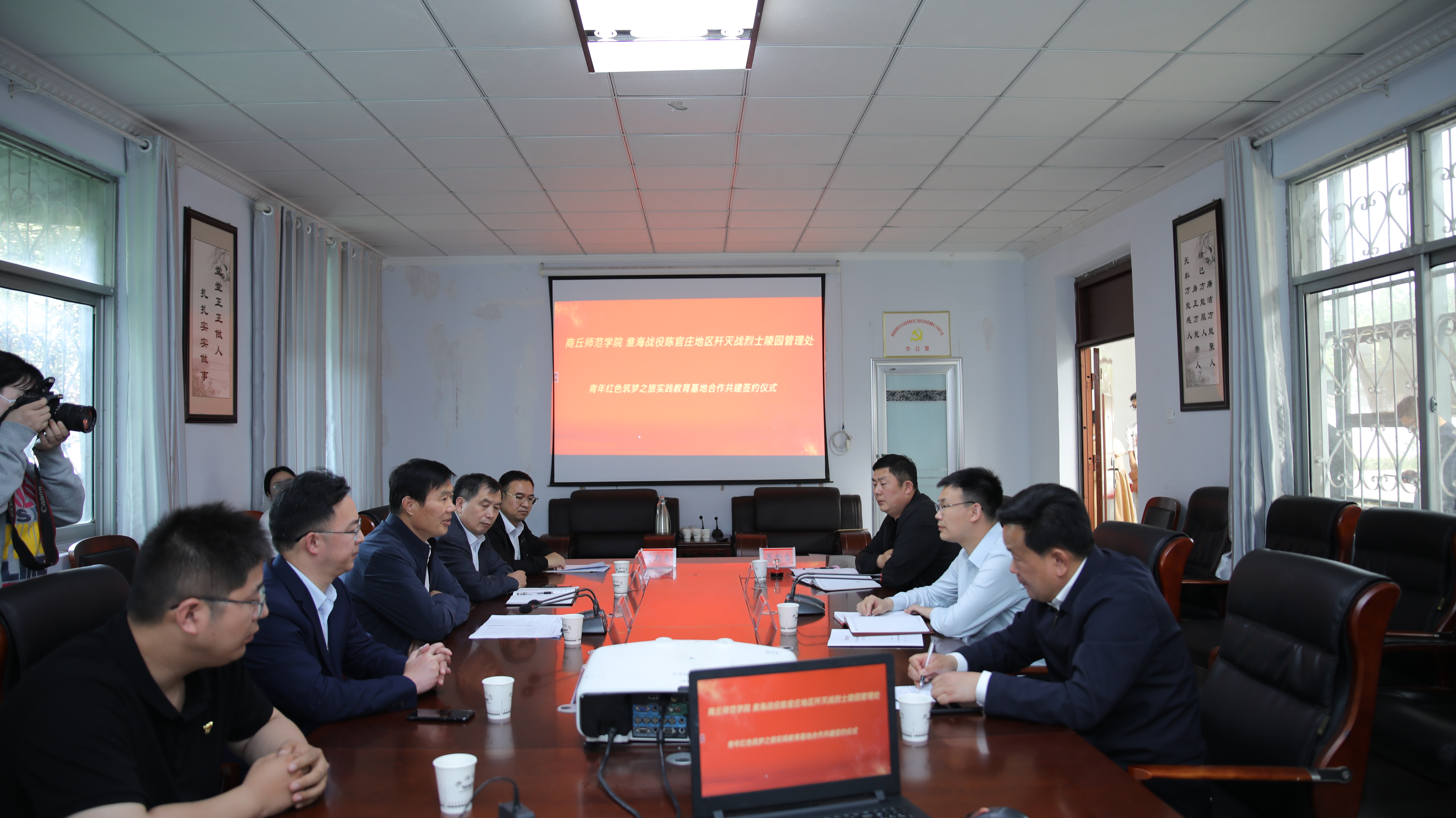5月11日,校党委副书记、工会主席朱伟带领师生一行赴淮海战役陈官庄地区歼灭战纪念馆开展座谈暨“青年红色筑梦之旅”教育实践基地签约和揭牌活动。永城市委副书记常忠伟、副市长张彩旗、淮海战役陈官庄地区歼灭战纪念馆张向远等出席活动,活动由张彩旗主持。