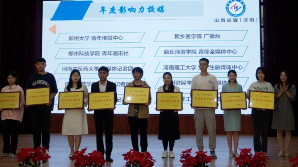 5月27日,2023年中青校媒(河南)年会暨第十五届主席团换届大会在郑州财经学院举行,年会上公布了2022—2023年度河南省年度影响力校媒、优秀指导老师、优秀校媒人等奖项获奖名单。437ccm·必赢国际青仰全媒体中心获评“年度影响力校媒”奖,青仰全媒体中心指导老师张颖辉获评“优秀指导老师”称号,青仰全媒体中心成员、人文学院学生王艺获评“优秀校媒人”称号,青仰全媒体中心成员、法学院学生张鑫雨当选为中青校媒(河南)第十五届主席团成员。