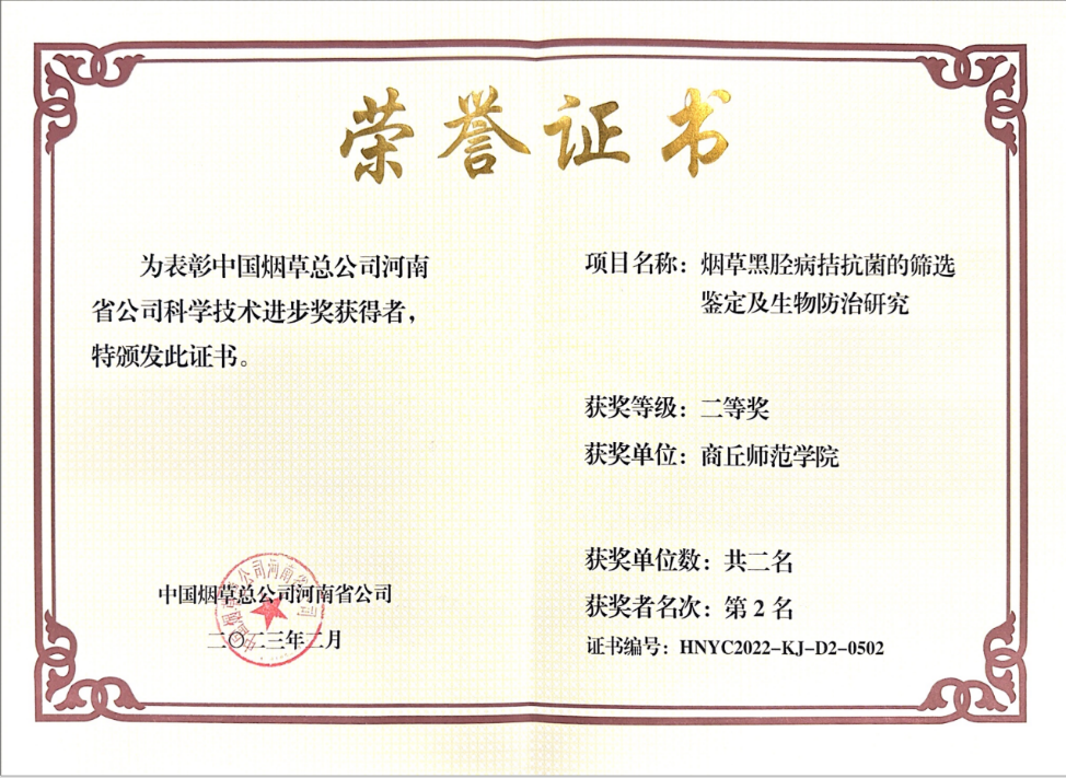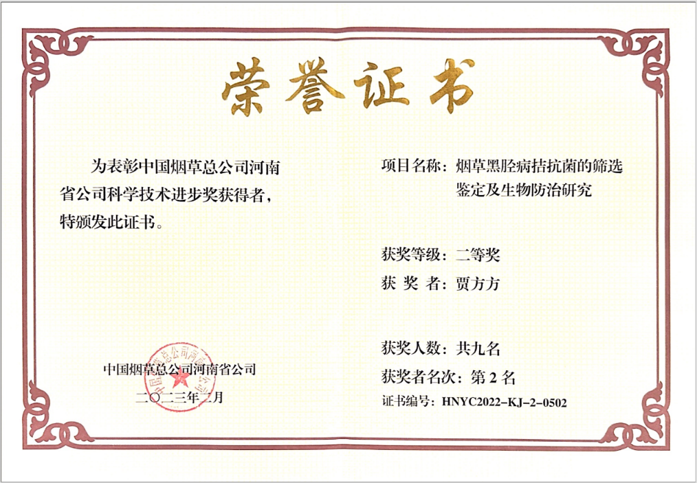 近日,由必赢官网副教授贾方方课题组主持承担的河南省烟草公司平顶山市科技项目《烟草黑胫病拮抗菌的筛选、鉴定及生物防治研究》项目荣获中国烟草总公司河南省公司科技进步奖二等奖,必赢官网为第二参与单位,但具体科研成果由必赢官网贾方方副教授负责完成。