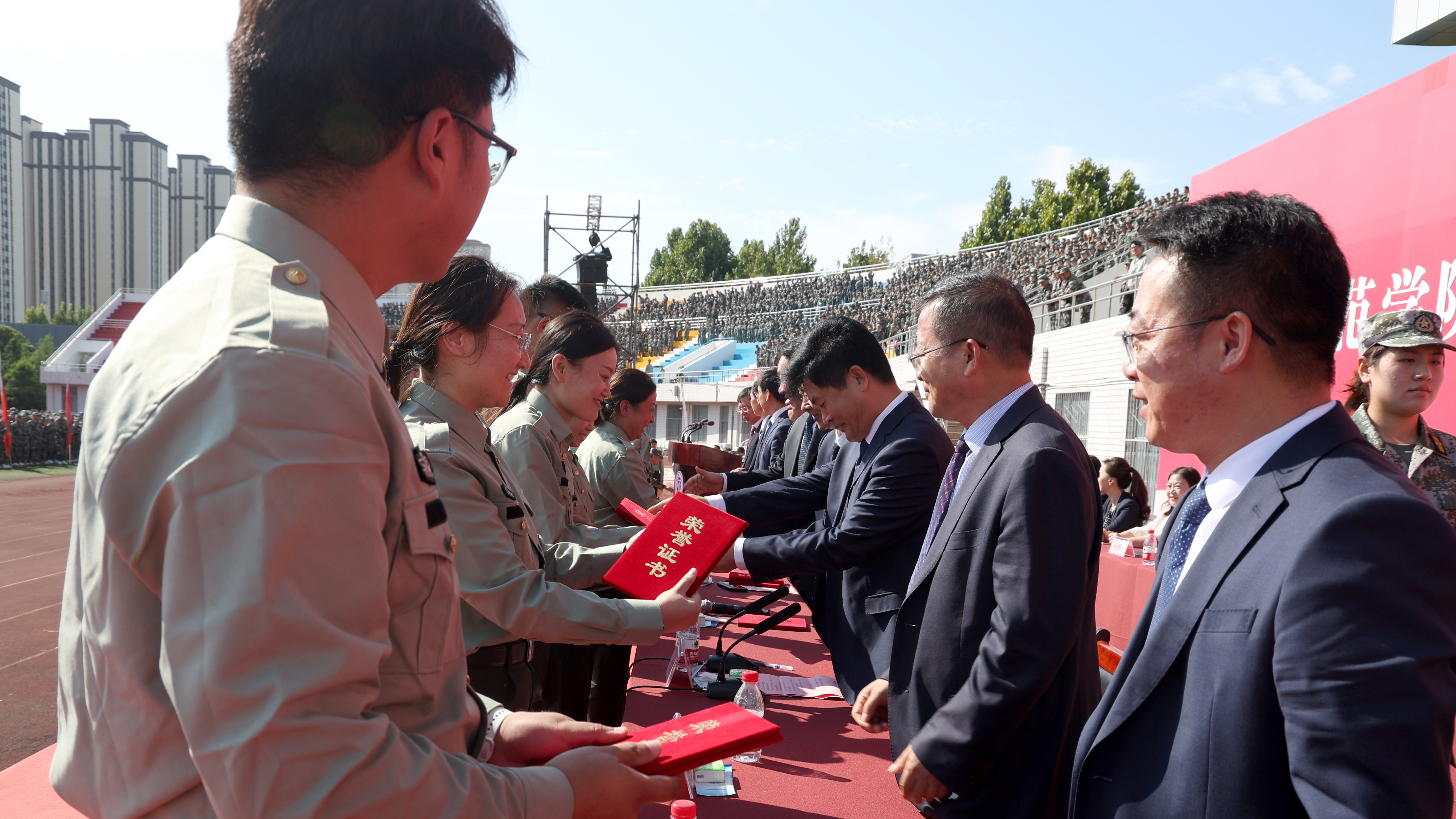 校领导为军训优秀连队、优秀指导员、优秀教官颁发荣誉证书