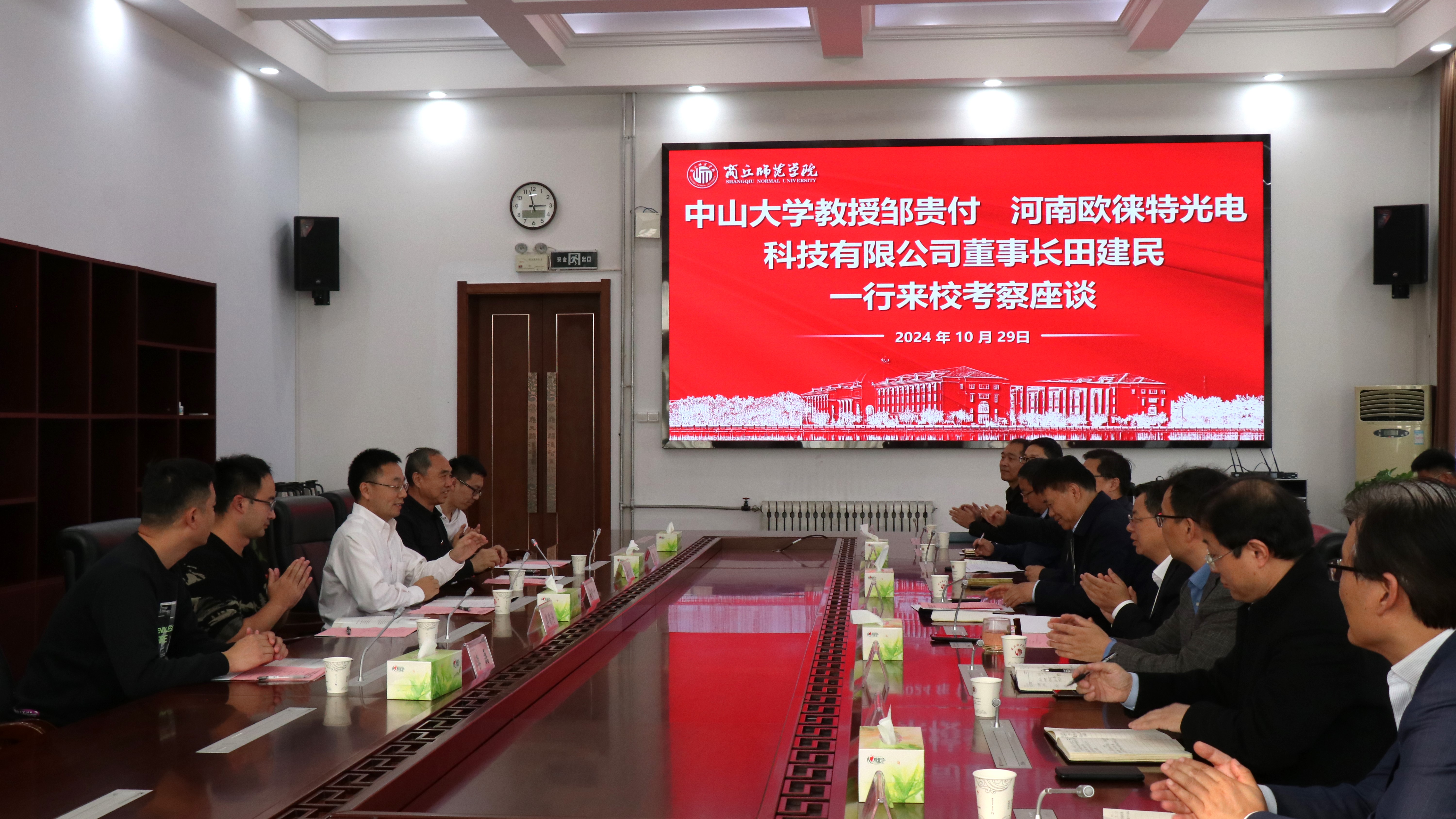 10月29日,中山大学教授邹贵付、河南欧徕特光电科技有限公司董事长田建民一行来校考察,并交流座谈。校党委副书记吴金山、副校长刘澜涛出席座谈会,会议由吴金山主持。