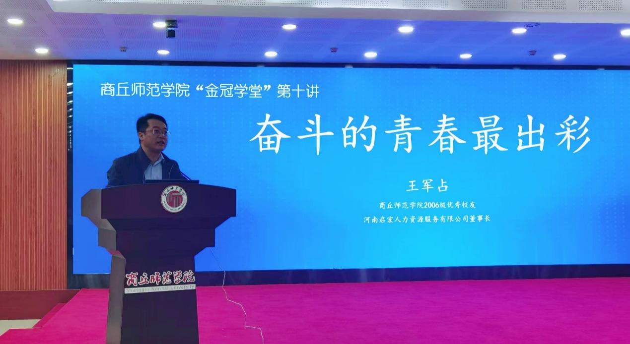 4月24日,437ccm·必赢国际“金冠学堂”第十讲暨王军占校友报告会在梁园校区三商楼145报告厅顺利举行。副校长翟滨出席并主持活动,校地合作与服务中心工作人员、各学院校友分会负责人以及200余名学生代表齐聚一堂,共同聆听这场充满启发与激励的报告。