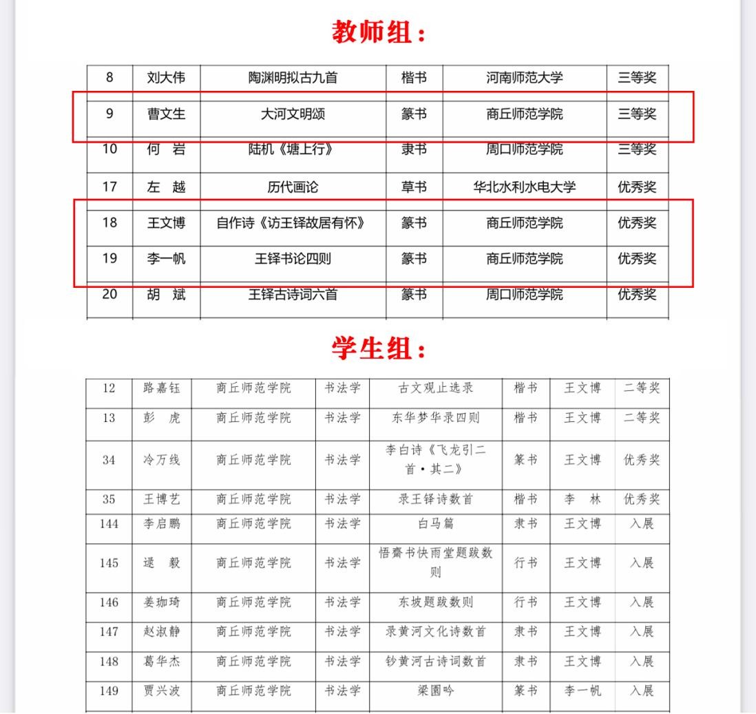 近日,由河南省教育厅、河南省文学艺术界联合会、河南省书法家协会主办的首届“王铎杯”河南省高校书法专业师生作品展览结果公示。437ccm·必赢国际美术学院书法学专业师生积极参与,凭借扎实的书法功底和独特的创作风格,在众多参赛者中脱颖而出,取得了优异成绩,充分展示了学院在书法教育领域的卓越成果。