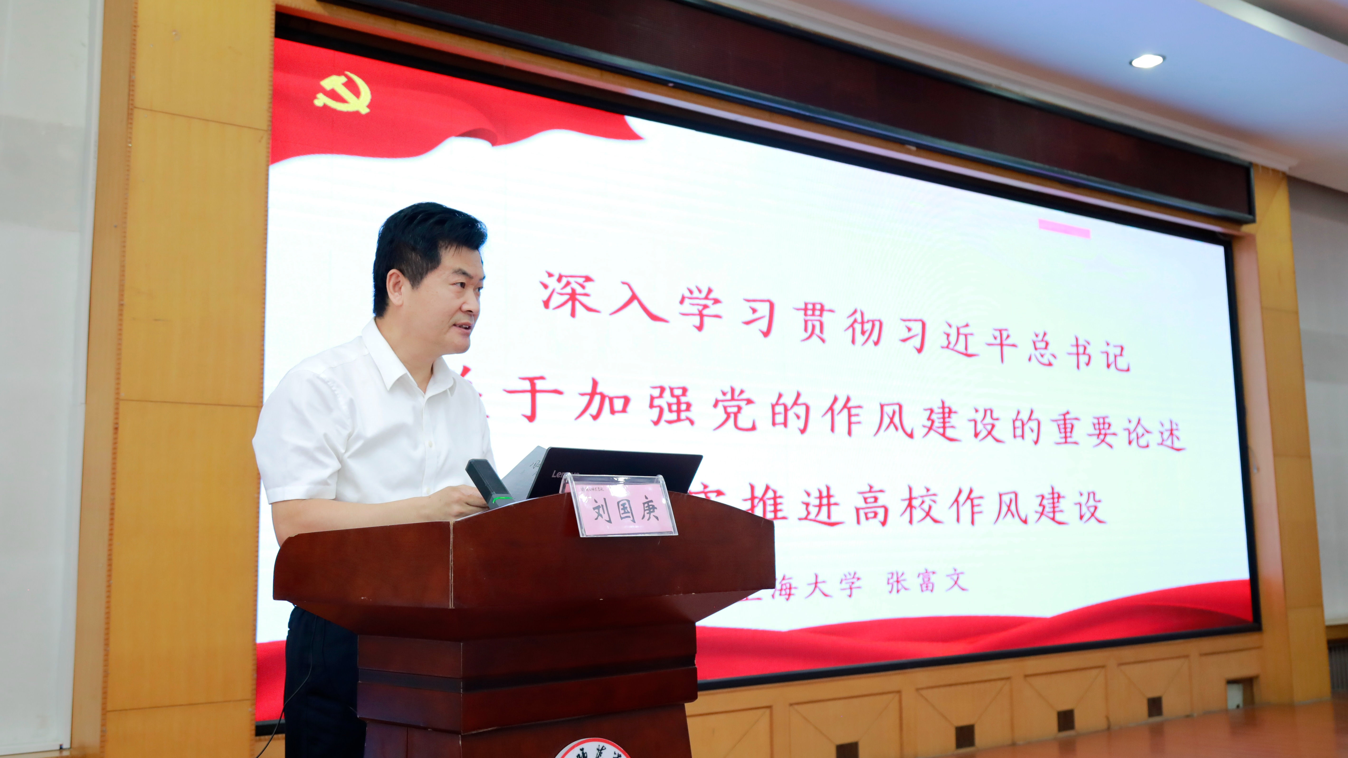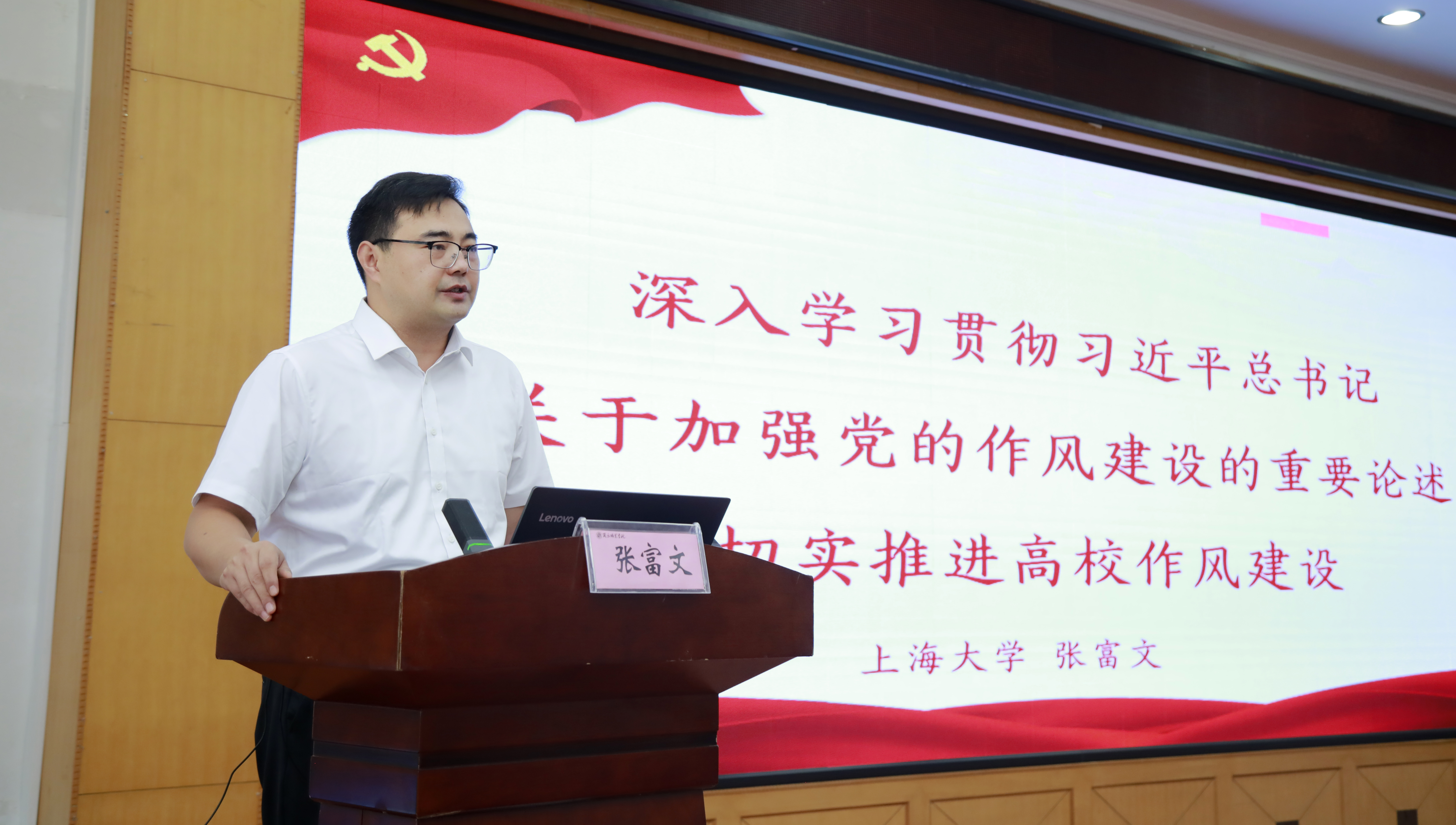 开班仪式后,上海大学教授张富文以《深入学习贯彻习近平总书记关于加强党的作风建设的重要论述切实推进高校作风建设》为题作了专题报告。校党委副书记刘国庚主持报告会。