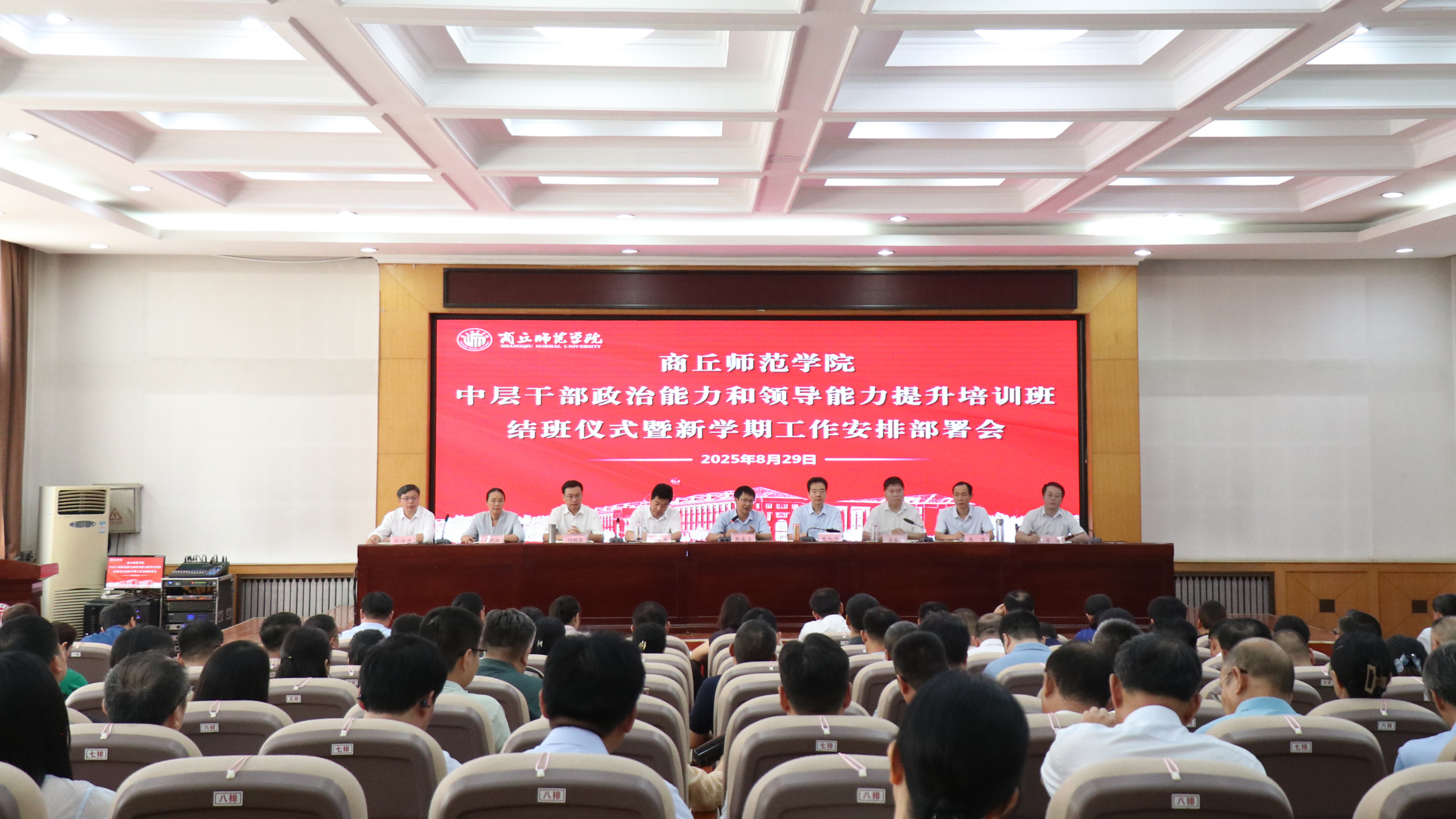 8月29日,必赢官网在梁园校区召开中层干部政治能力和领导能力提升培训班结业仪式暨新学期工作部署会议,校领导张尚字、陈向炜、刘国庚、吴金山、何瑞强、张箭、王晓征、翟滨、刘澜涛和全体中层干部出席参加会议。校党委书记张尚字讲话,校长陈向炜安排部署新学期重点工作,党委副书记吴金山主持会议。