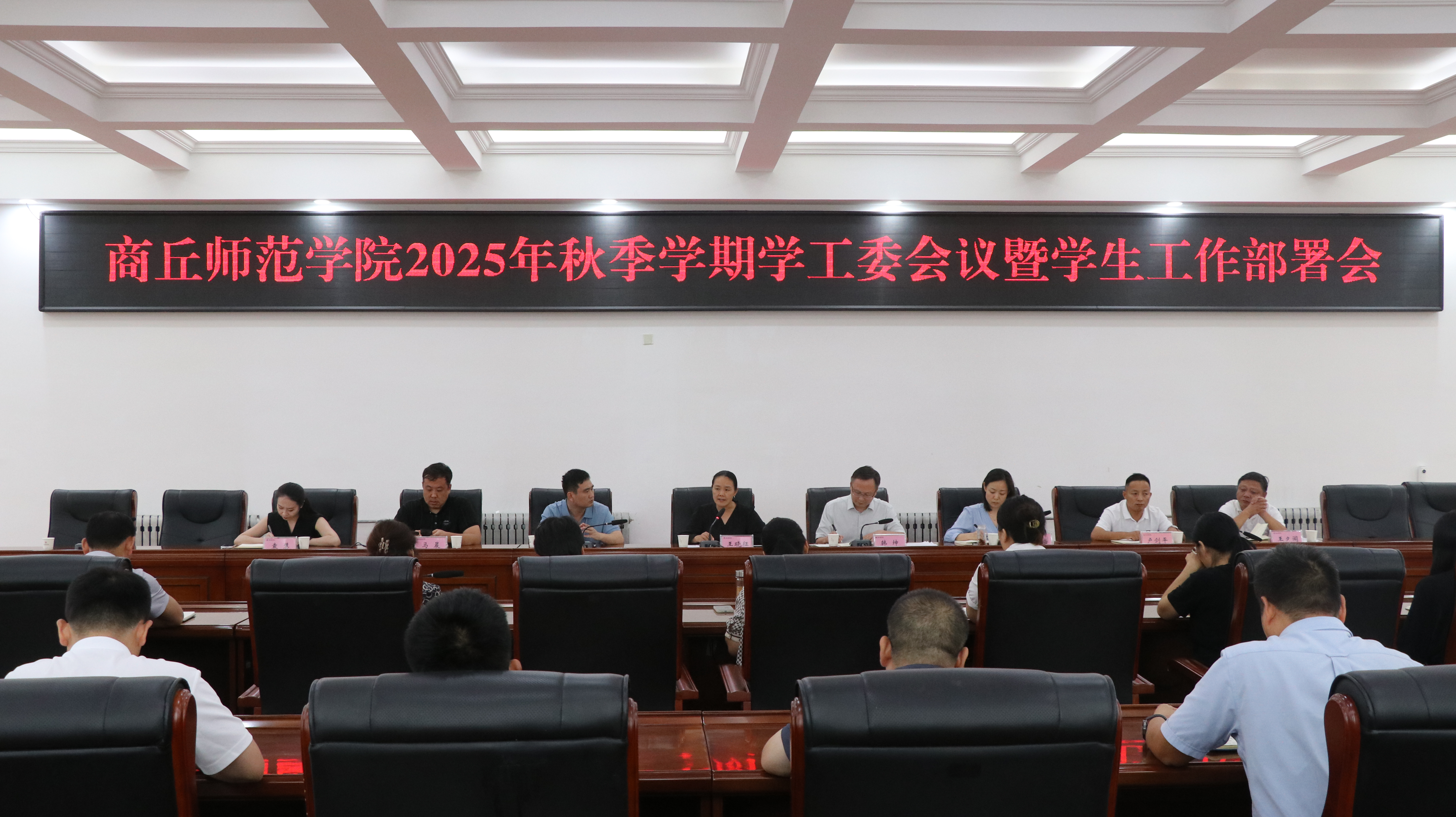 学工部、学生处负责同志就2025年秋季学期学生工作要点作了全面介绍,并就数字化迎新工作、智慧学工2.0平台启用及暑期留校学生教育管理服务工作作了专题汇报。保卫处负责同志聚焦校园安全稳定,对交通与车辆管理、消防安全教育、防范电信网络诈骗等专项工作进行了部署。校团委负责同志围绕迎新志愿服务、智慧团建、暑期社会实践工作等进行了安排。党委宣传部负责同志就网络思想政治阵地建设、网络风险研判与舆情引导管理等工作进行了强调。后勤服务中心负责同志对学生宿舍管理优化、餐饮服务保障提升等事宜作出了具体部署。