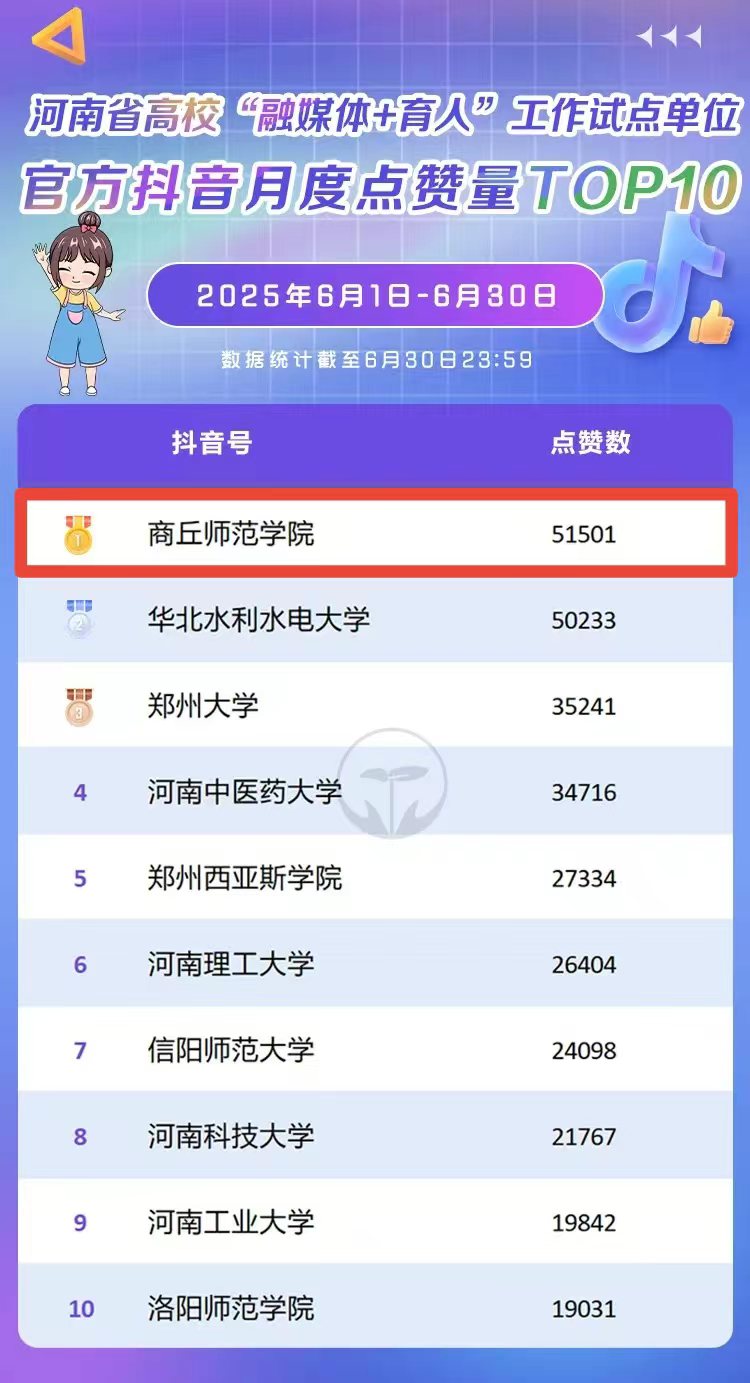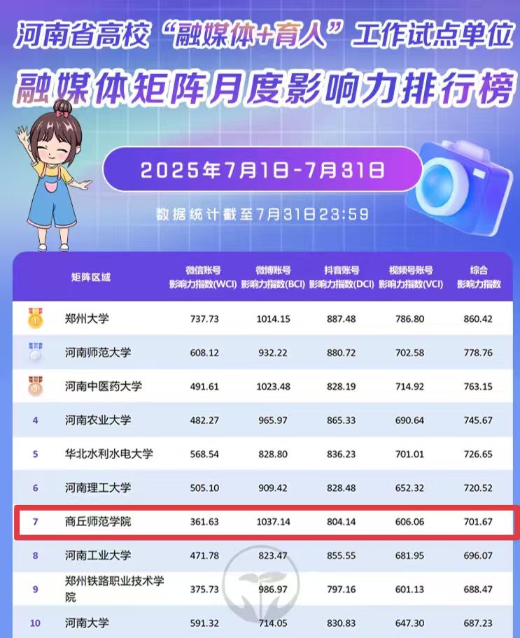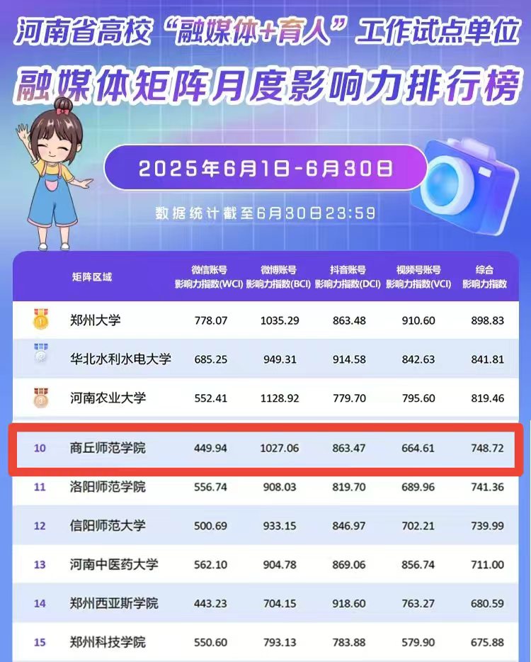 据省教育厅“豫教思语”微信公众号发布的河南省高校“融媒体+育人”工作试点单位和培育单位融媒体矩阵月度影响力(WCI、BCI、DCI、VCI)月度排行榜,2025年1月到7月,必赢官网官方新媒体矩阵在河南省高校排名继续保持前列,分别位居第7、第11、第10、第9、第8、第10和第7名。其中,官方抖音6月份排行位居河南省高校第1名。