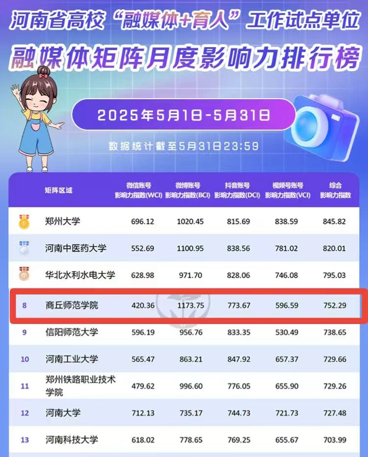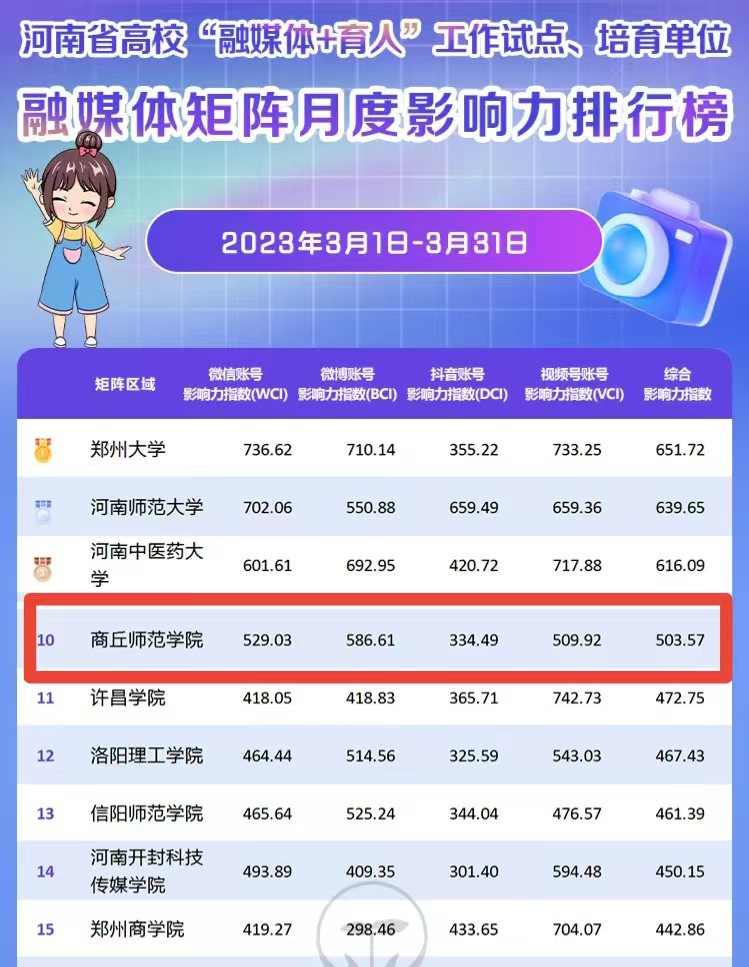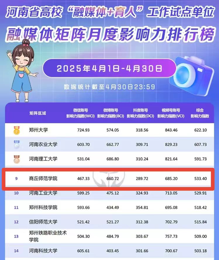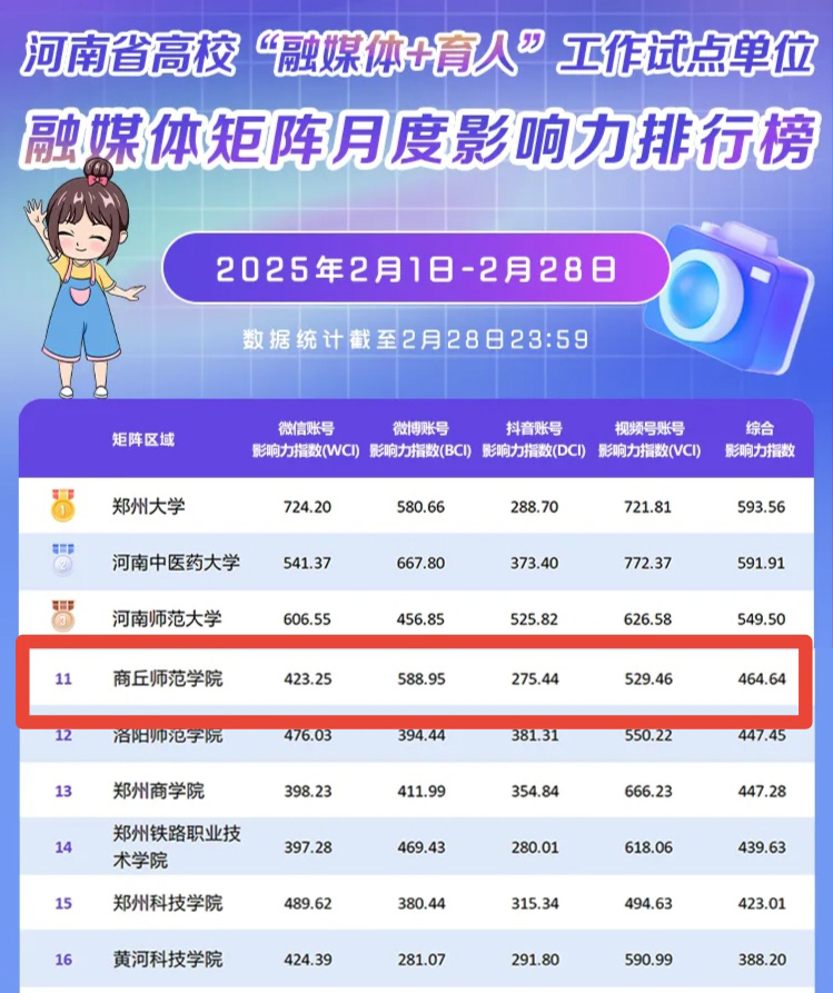 据了解,该排行榜对各高校融媒体矩阵区域包含的微信、微博、抖音、视频号进行综合考量和评价。河南省教育厅根据和采用第三方平台(清博指数)监测到的数据,对河南省教育系统新媒体综合传播力进行月度排名并整理发布。排行榜对全省高校官方融媒体矩阵的内容质量、传播力和贡献力进行加权计算,得出总分,是目前在全省高校官方融媒体矩阵中影响力较大的综合评价体系。