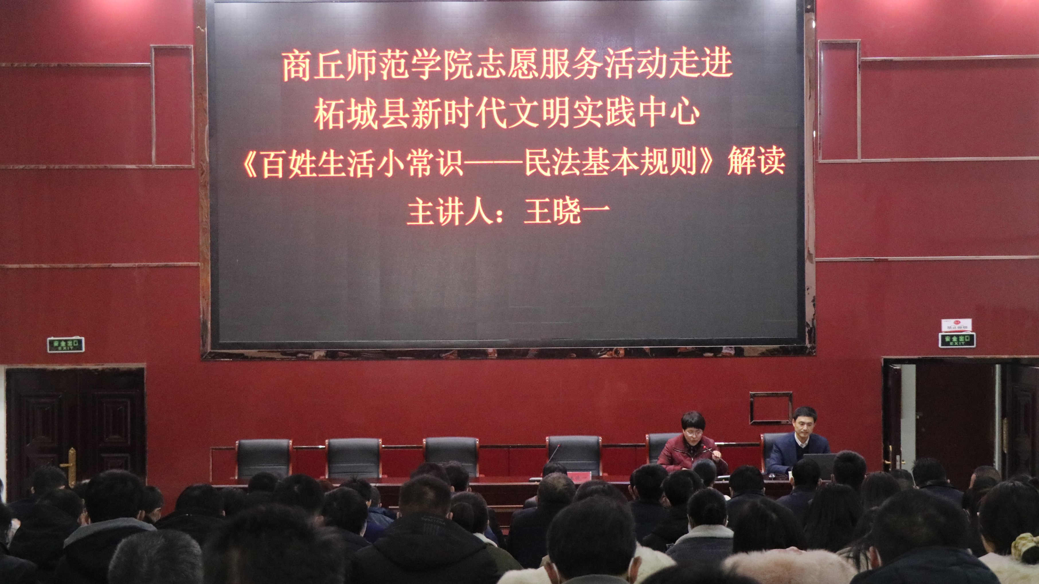 结队帮扶活动分理论宣讲和乡村少年宫支教两大环节进行。理论宣讲环节,法学院王晓一老师以《百姓生活小常识——民法基本规则解读》为题,为柘城县县直各单位代表150余人进行了《民法典》解读。王老师的宣讲深入浅出,把最新的法律专业知识与日常生活案例紧密结合,既有一定的理论高度,又有一定的现实观照。