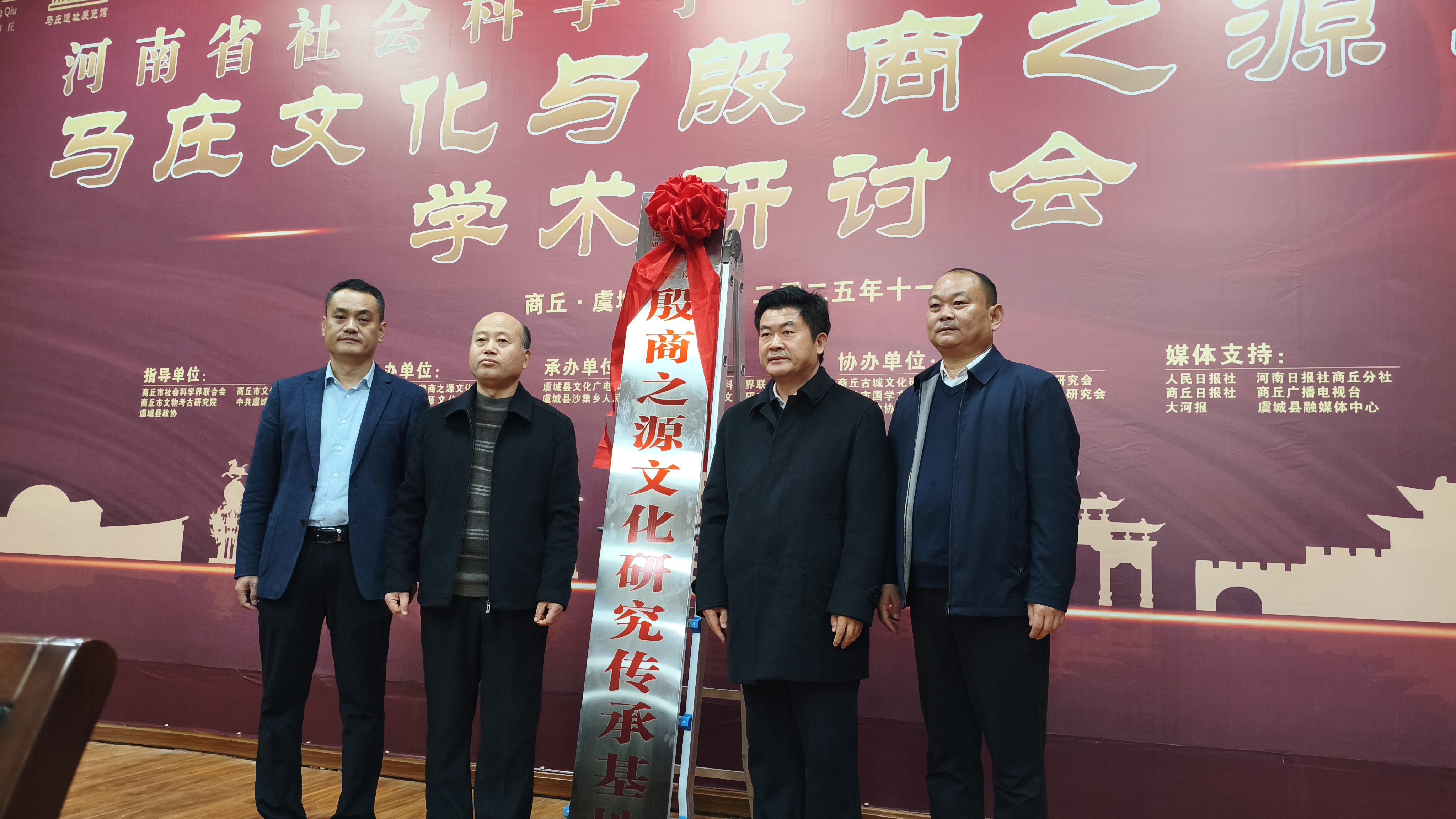 437ccm·必赢国际党委副书记刘国庚,商丘市委党校党委书记、常务副校长周鹰翔,虞城县委常委、宣传部部长、副县长张东林,虞城县沙集乡党委书记卢允博共同为“商丘市殷商之源文化研究传承基地”揭牌。