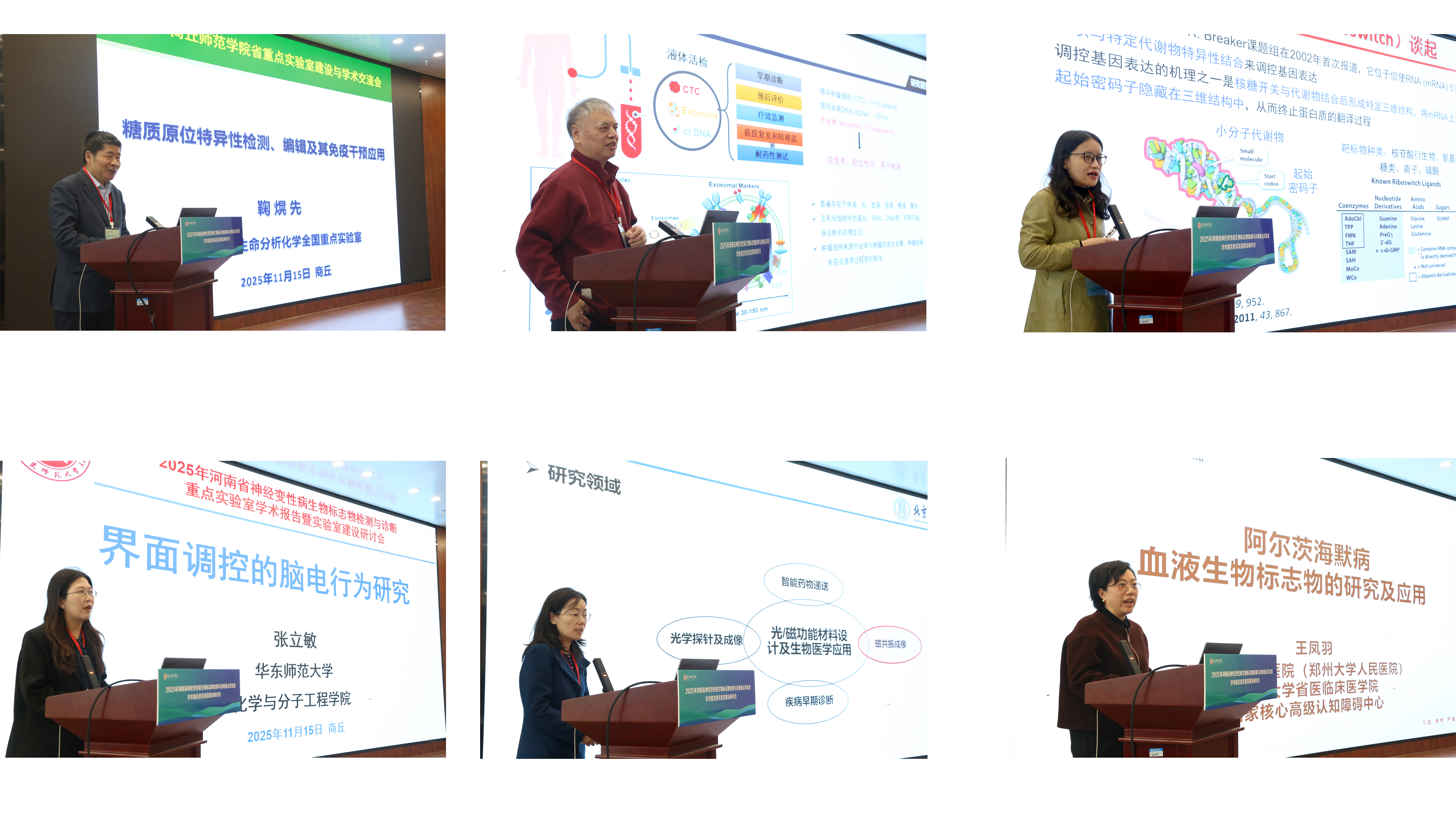 在学术报告环节,6名学者做了精彩的学术报告:南京大学鞠熀先教授做了题为《糖质原位特异性检测、编辑及其免疫干预应用》的报告,为神经变性病的早期诊断提供了新的技术思路;东南大学刘松琴教授做了题为《植物外泌体制备与应用》的报告,拓展了生物标志物检测的材料应用边界;武汉大学袁荃教授做了题为《基于功能核酸的分子识别设计及生物分析应用》的报告,为生物标志物的高灵敏检测提供了理论与技术支撑;华东师范大学张立敏教授做了题为《基于界面调控的脑电行为研究》的报告,为神经变性病的脑功能机制研究提供新视角;北京化工大学许苏英教授以《活体影像探针构筑及应用》为题,介绍了活体影像探针助力神经变性病的动态诊断方面的研究;河南省人民医院王凤羽主任则聚焦临床应用,作了题为《阿尔茨海默病血液生物标志物的研究及应用》的报告,分享了血液生物标志物检测的临床研究成果。报告会由本次大会主席鞠熀先教授主持。