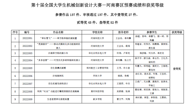 8月4日,“第十届全国大学生机械创新设计大赛”河南赛区比赛结果在河南省机械工程学会网站公布,此次比赛于6月25日至26日在郑州大学举办,共吸引全省各高校137支队伍。