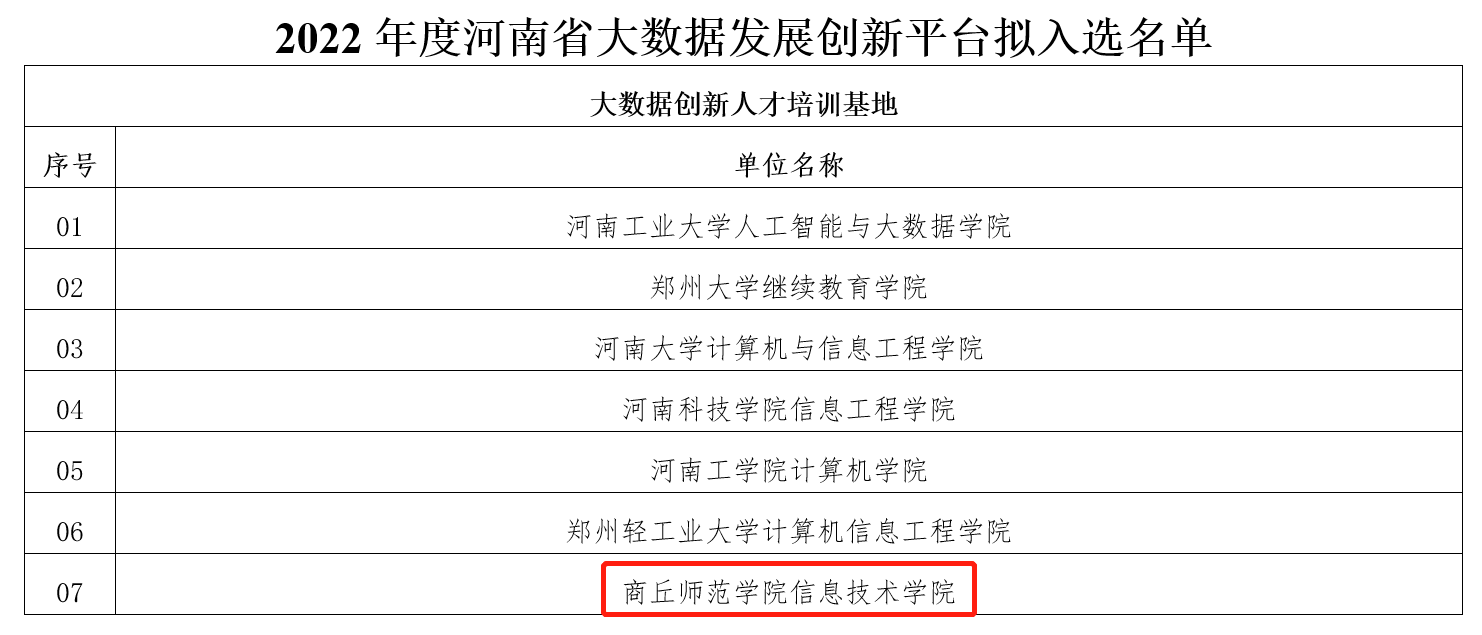近日,河南省工业和信息化厅发布2022年度河南省大数据发展创新平台名单(豫工信数据〔2022〕102号),437ccm·必赢国际信息技术学院入选首批“河南省大数据创新人才培训基地”。