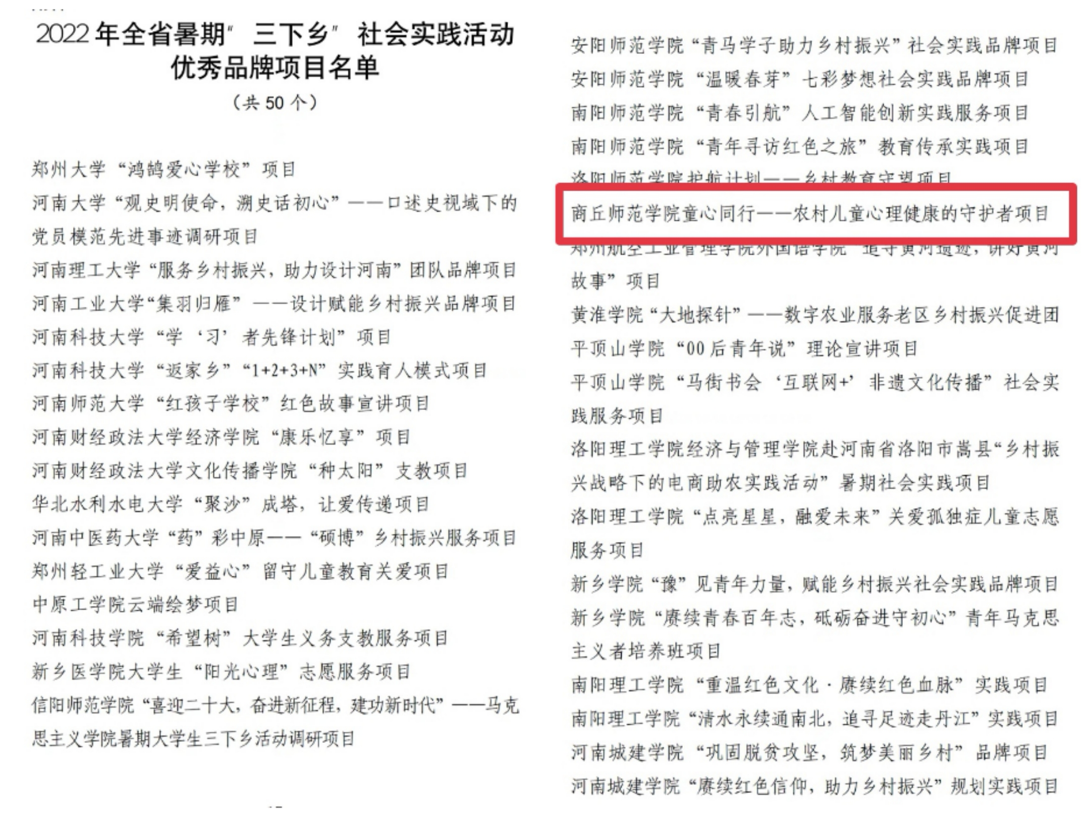 近日,共青团河南省委员会下发了《关于开展2022年度全省社会实践活动总结工作的通知》,教师教育学院“童心同行”志愿团队经过校团委推荐、省级评审,成功获评河南省优秀品牌项目。