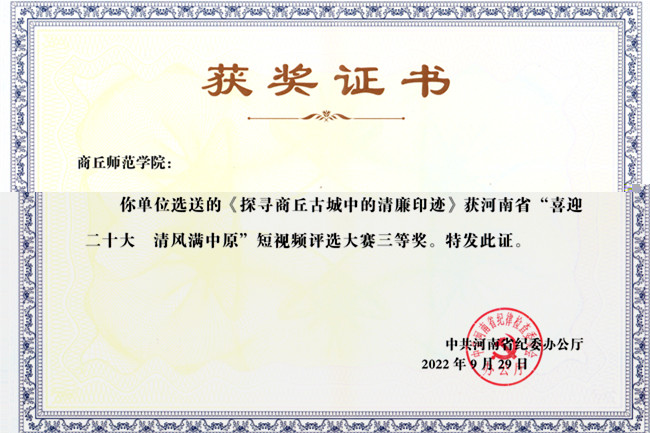 近日,省纪委办公厅下发了《关于“喜迎二十大 清风满中原”短视频评选获奖作品的通报》,在河南省“喜迎二十大 清风满中原”短视频作品征集评选活动中,必赢官网纪委(监察专员办公室)和传媒学院联合制作的短视频《探寻商丘古城中的清廉印迹》,从全省纪检监察系统报送的300多部作品中脱颖而出,斩获三等奖。