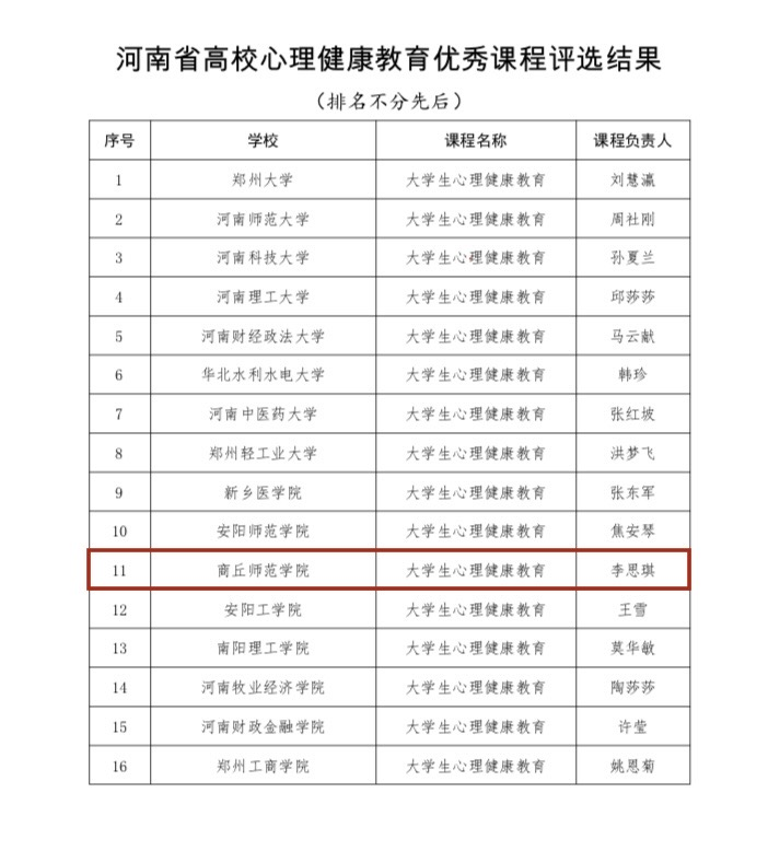 近日,《中共河南省委教育工作委员会 河南省教育厅关于公布全省高校心理健康教育优秀课程评选结果的通知》下发,必赢官网教师教育学院李思琪老师申报的《大学生心理健康教育》课程成功获批。