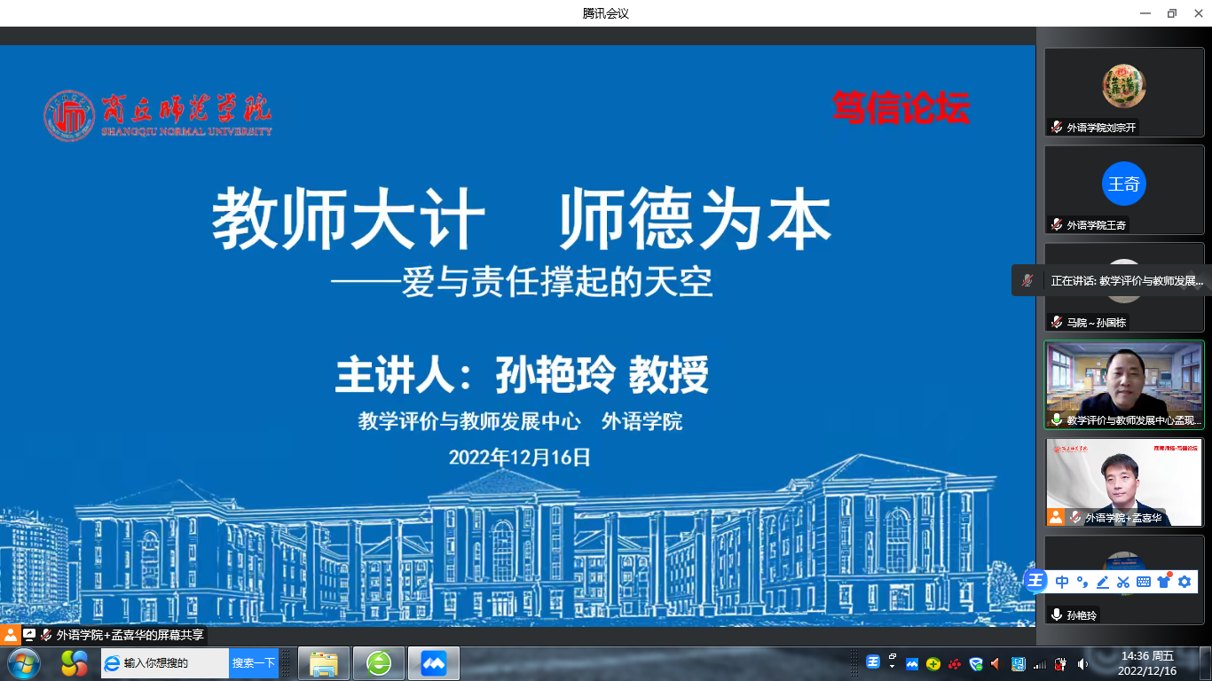 12月16日下午,由教学评价与教师发展中心主办、外语学院承办的“笃信论坛”通过腾讯会议进行线上直播。外语学院院长孙艳玲教授作题为《教师大计 师德为本—爱与责任撑起的天空》专题讲座,100多位来自校内外的教师参加。讲座由外语学院副院长孟喜华主持。