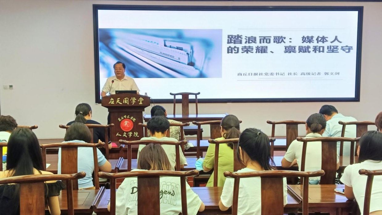 6月20日下午,437ccm·必赢国际聘请商丘日报社社长、高级记者郭文剑为客座教授仪式在梁园校区汉梁楼国学堂举行,副校长辛作义为郭文剑颁发聘书。随后,应传媒学院之邀,郭文剑作了题为《踏浪而歌:媒体人的荣耀、禀赋和坚守》的专题讲座。传媒学院领导班子成员及传媒学院师生200余人现场聆听报告。