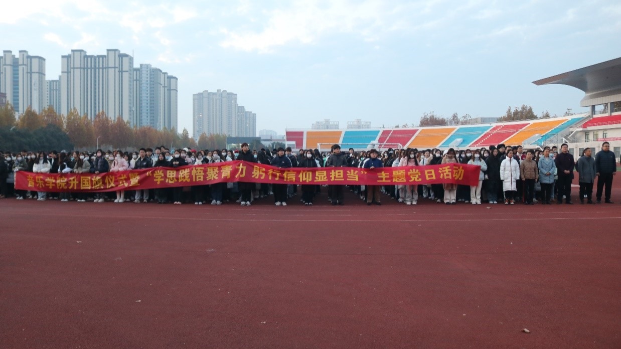 为深入学习贯彻习近平新时代中国特色社会主义思想,不断加强学生的爱国主义教育,扎实有效开展学生党支部主题党日活动,12月4日,音乐学院在平原路校区体育场举行升旗仪式暨“学思践悟聚青力 躬行信仰显担当”主题党日活动。副校长王晓征出席活动。