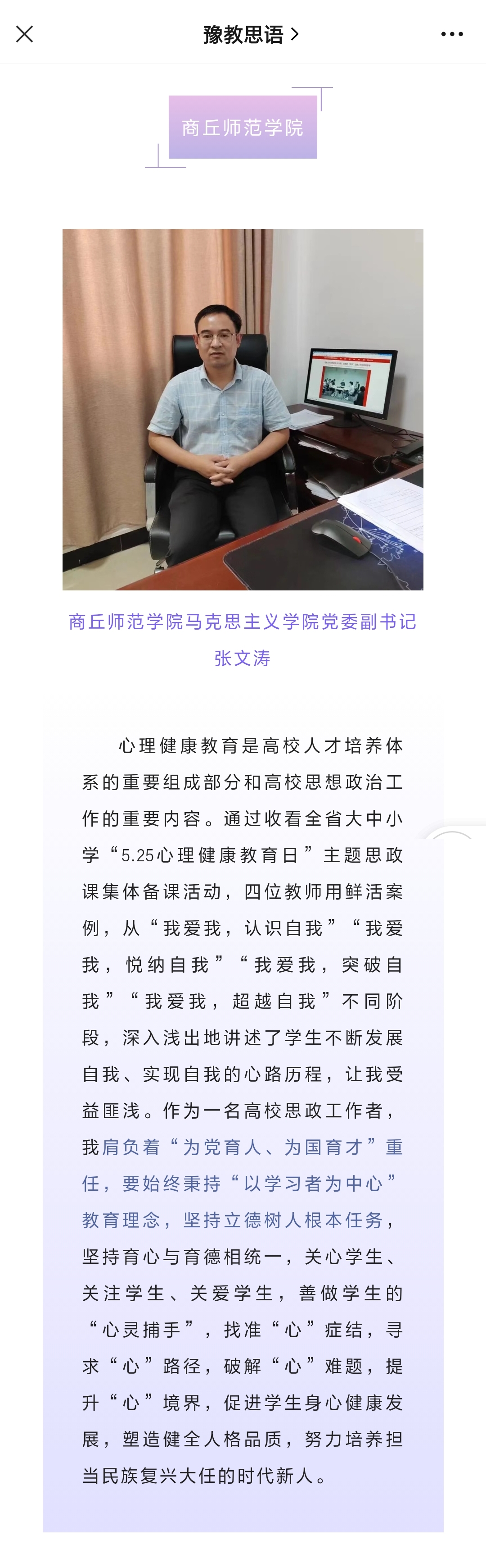 5月25日上午,由省委教育工委、省教育厅主办,南阳市教育局、南阳师范学院承办的全省大中小学“5.25心理健康教育日”主题思政课集体备课活动在线上展开。全省各学校结合当前疫情防控形势和要求,通过多种方式收看了此次活动直播,并就活动主题展开热烈讨论。今天,和思语一起来看我省各学校的教师有哪些心得体会。