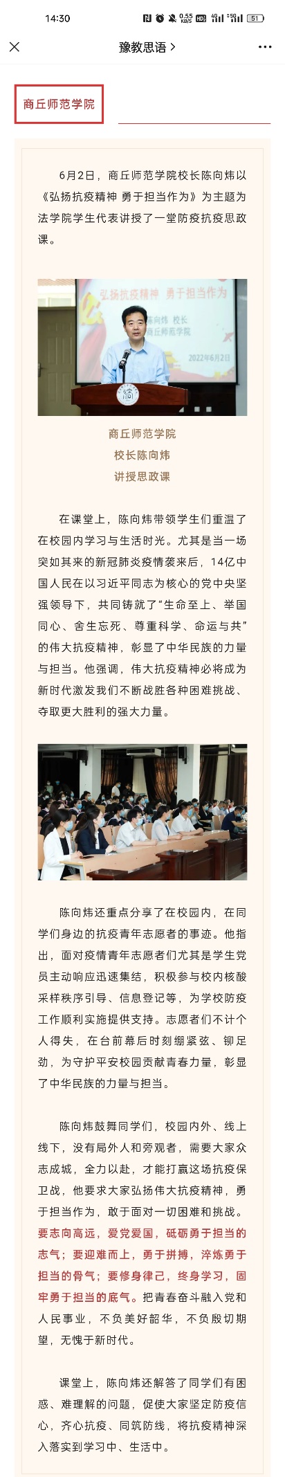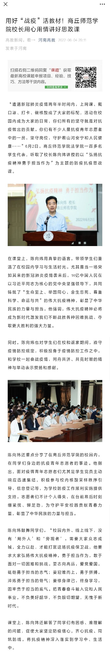 “遭遇新冠肺炎疫情两年半时间内,上网课、戴口罩、打卡、做核酸成了大家的标配,活动在校园内成为大家的日常,你们所有的坚守就是对抗疫做出的贡献。你们有不少人是抗疫青年志愿者中的一员,坚守岗位,守护着山河安宁和人民健康……”6月2日,437ccm·必赢国际法学院一百多名学生代表,听取了校长陈向炜讲授的以“弘扬抗疫精神勇于担当作为”为主题的防疫抗疫思政课。