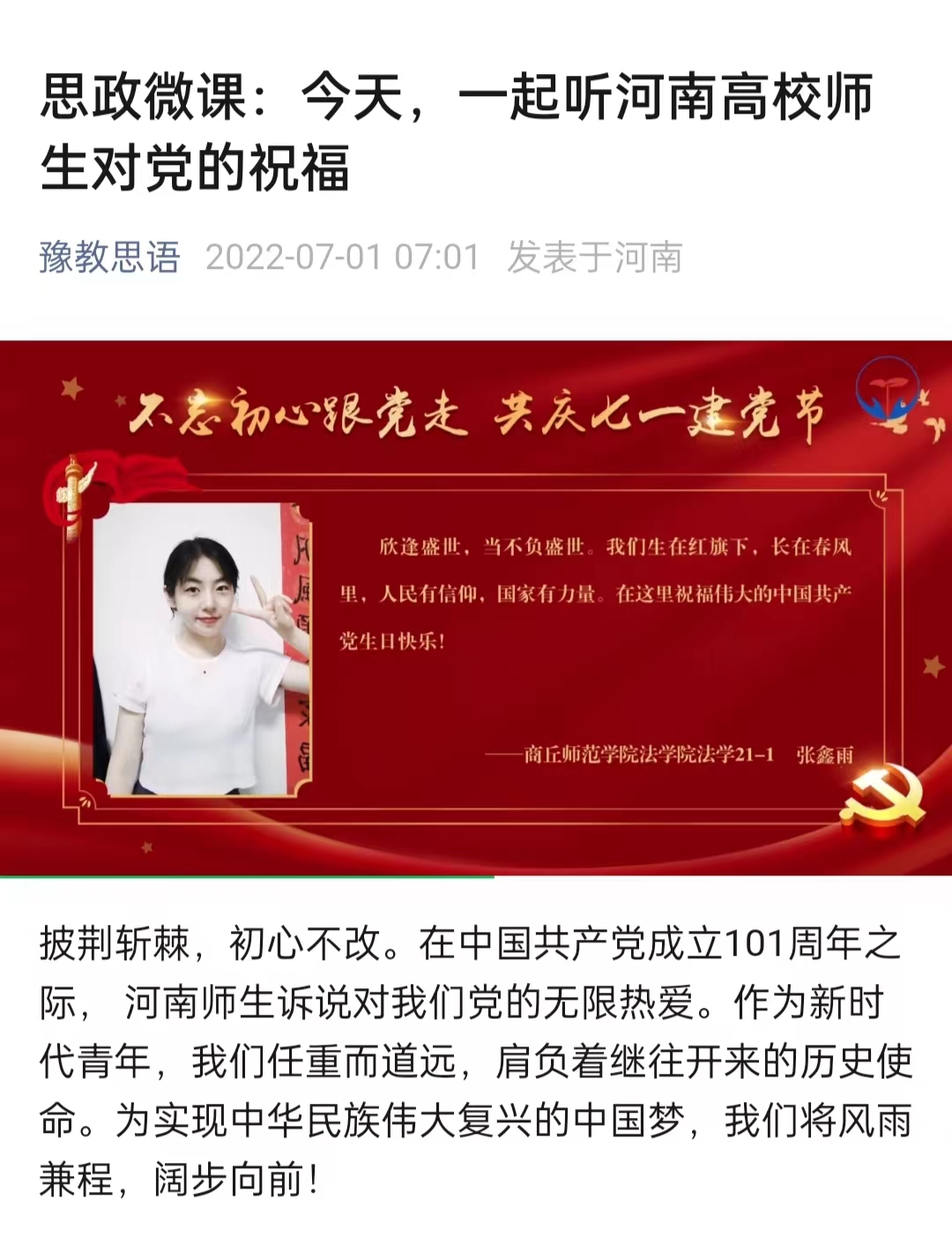披荆斩棘,初心不改。在中国共产党成立101周年之际, 河南师生诉说对我们党的无限热爱。作为新时代青年,我们任重而道远,肩负着继往开来的历史使命。为实现中华民族伟大复兴的中国梦,我们将风雨兼程,阔步向前!