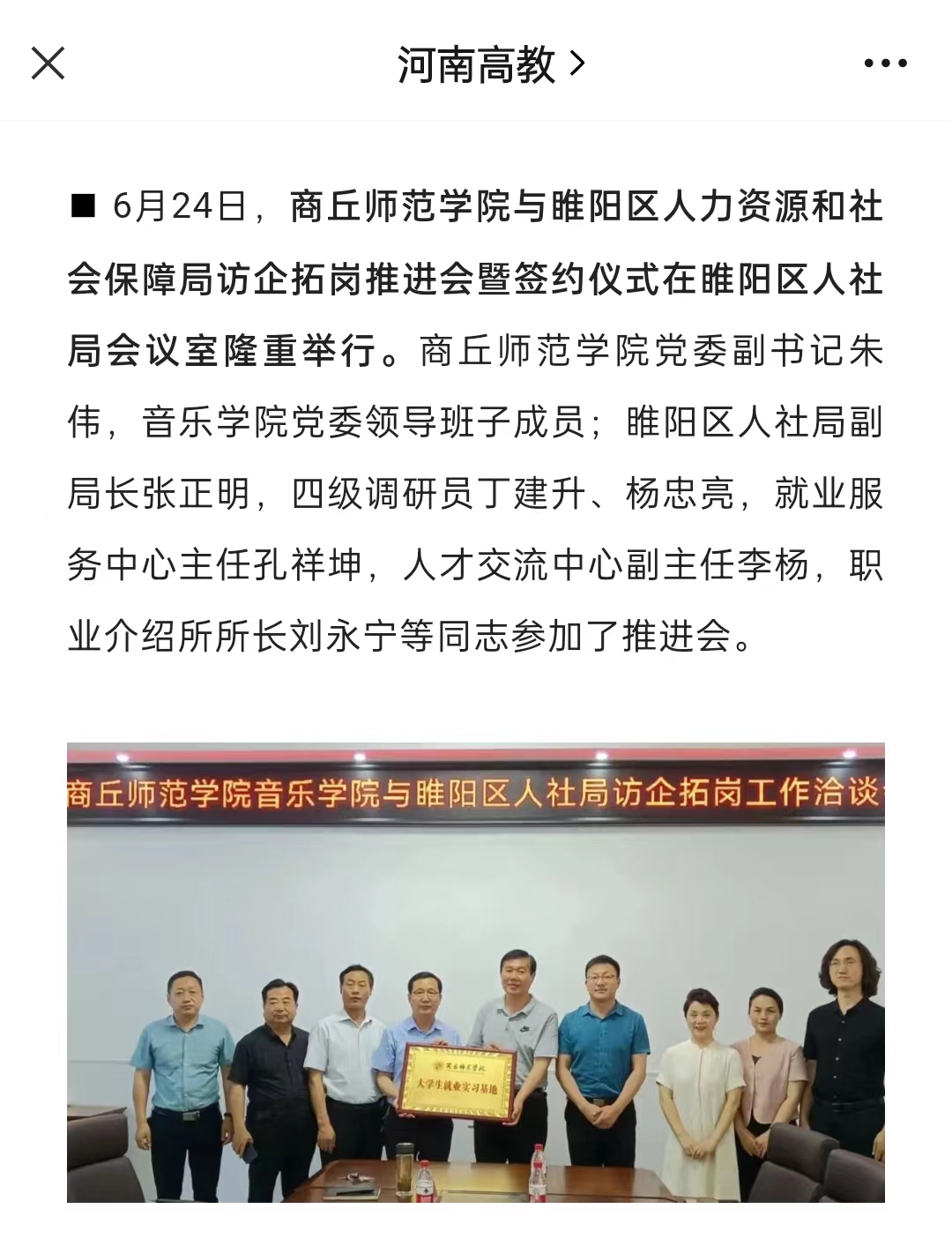6月24日,437ccm·必赢国际与睢阳区人力资源和社会保障局访企拓岗推进会暨签约仪式在睢阳区人社局会议室隆重举行。437ccm·必赢国际党委副书记朱伟,音乐学院党委领导班子成员;睢阳区人社局副局长张正明,四级调研员丁建升、杨忠亮,就业服务中心主任孔祥坤,人才交流中心副主任李杨,职业介绍所所长刘永宁等同志参加了推进会。