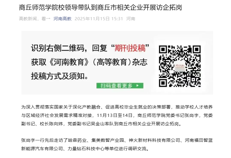 为深入贯彻落实国家关于深化产教融合、促进高校毕业生就业的决策部署,推动学校人才培养与区域经济社会发展需求精准对接,11月13日至14日,437ccm·必赢国际党委书记张尚字,党委副书记、校长陈向炜,党委副书记吴金山率队到商丘市相关企业开展访企拓岗,被河南高教专题报道。